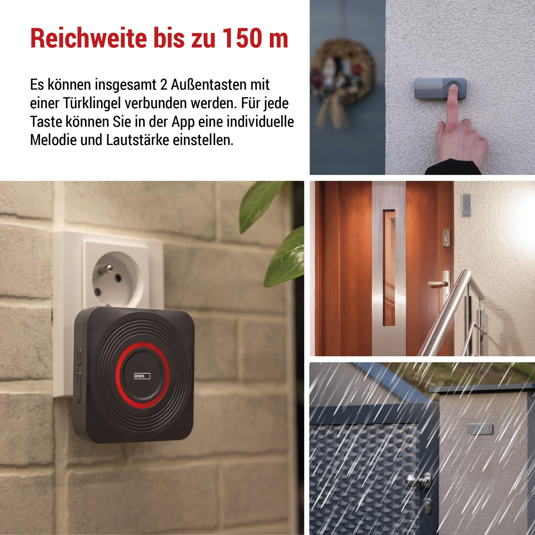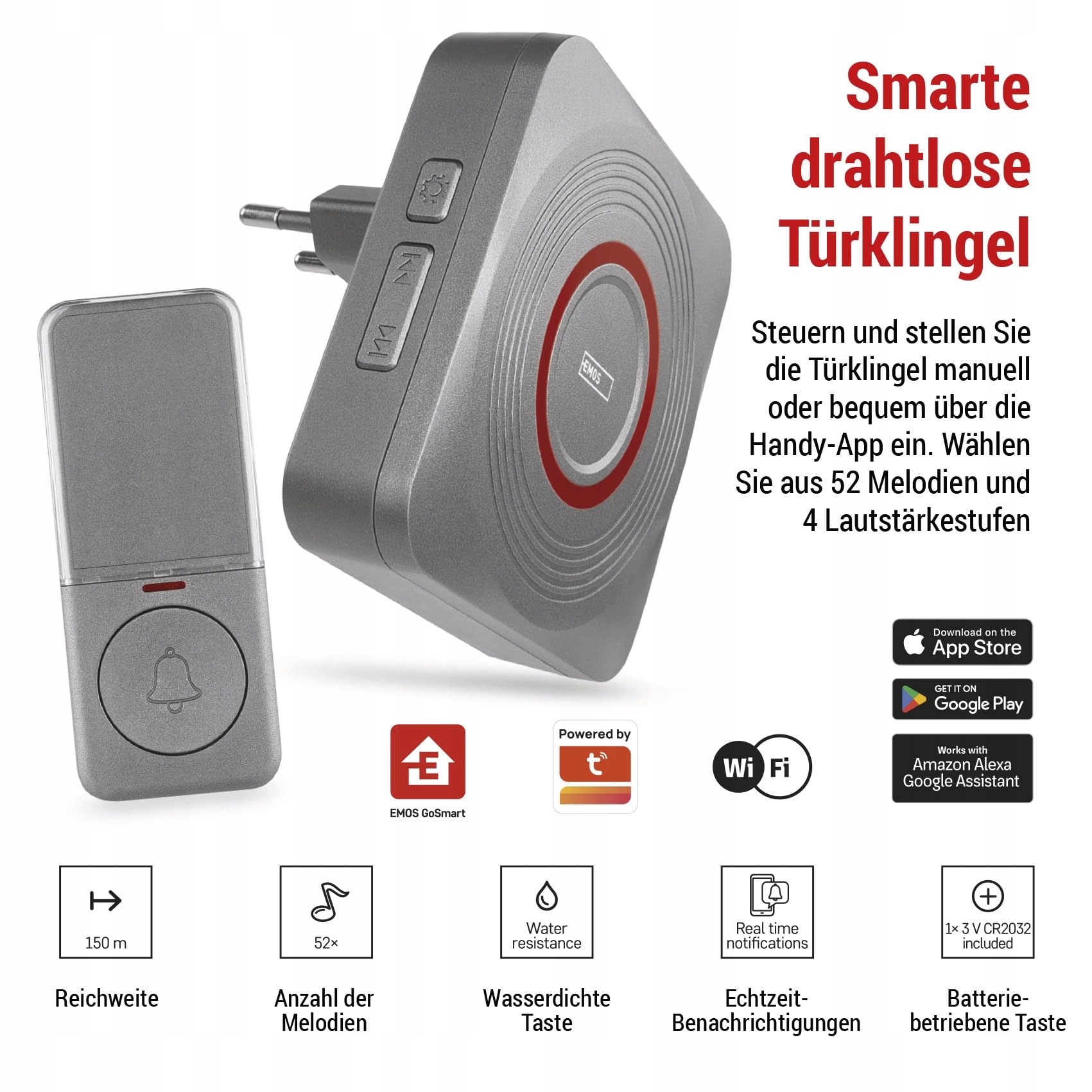 EMOS GoSmart - Zestaw bezprzewodowego dzwonka do drzwi z aplikacją - WiFi - bezprzewodowy, 52 melodie, zasięg 150m, 4 poziomy głośności do 110 dB - w tym bateria - srebrny