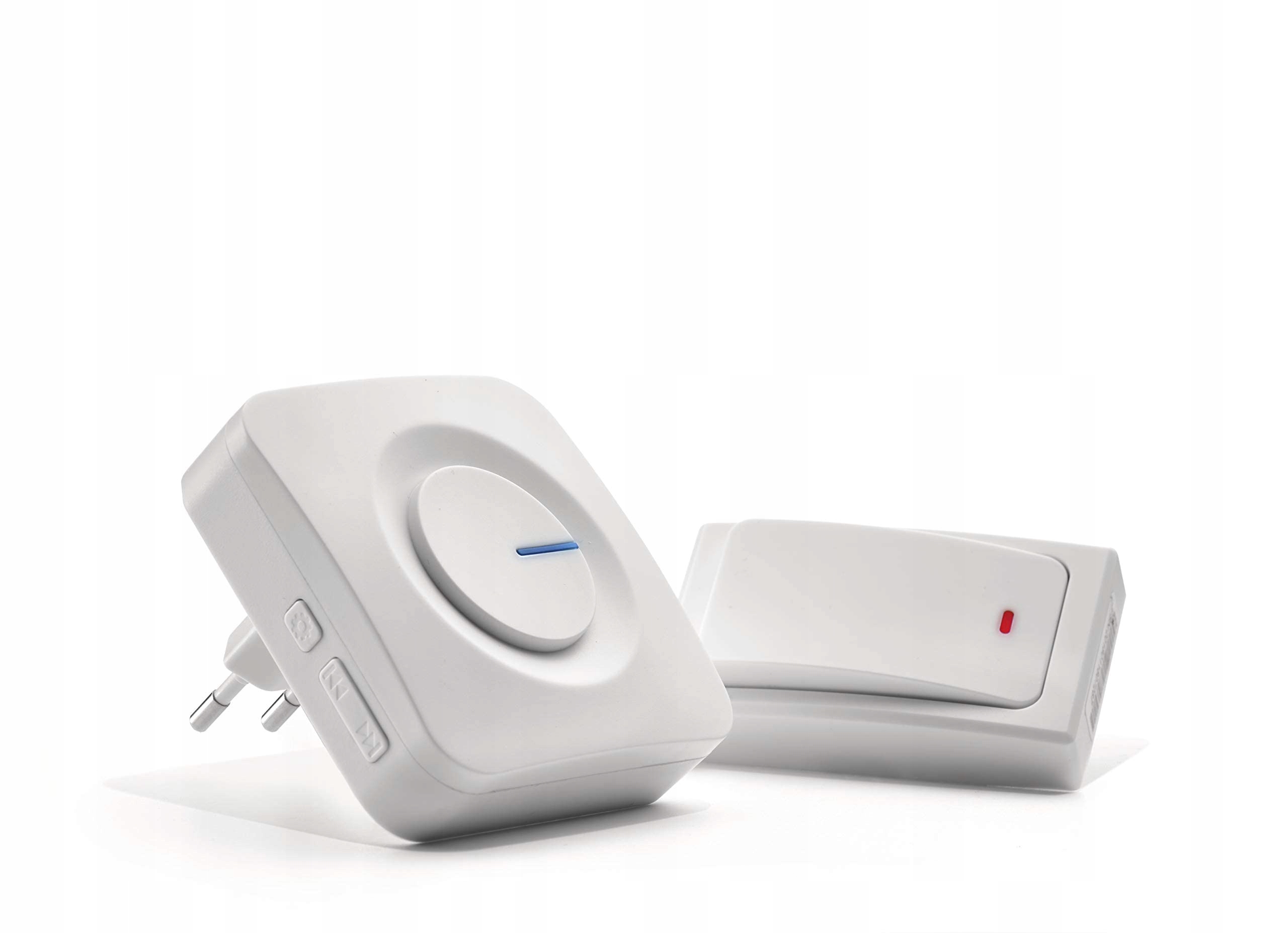 Zestaw nadajnik + odbiornik (przycisk dzwonka + dzwonek) z FUNKCJĄ SAMOUCZENIA: dzwonek i przycisk są automatycznie sparowane na częstotliwości 433 mHz. Brak zakłóceń z systemem sąsiadów