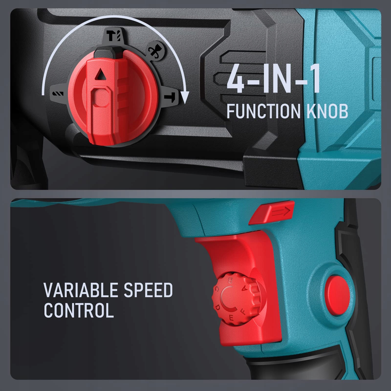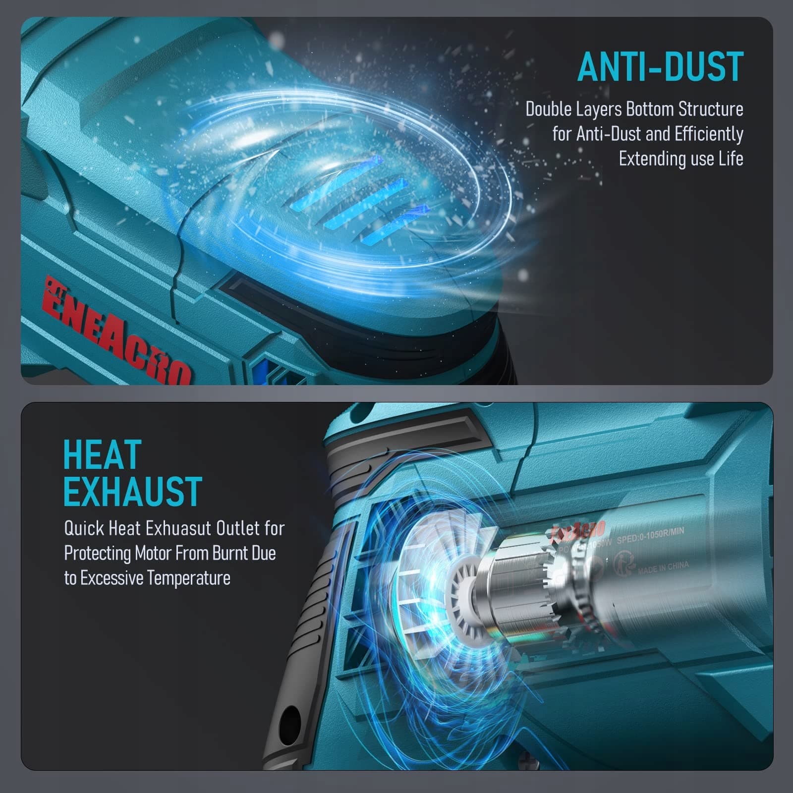 ✅【Wysoka wydajność i efektywność】Silnik 1050W z energią uderzenia 3,5JOULES, 0-5100BPM i 0-1050RPM jest optymalny do realizacji różnych projektów. Dzięki 6-stopniowej regulacji prędkości masz zawsze pełną kontrolę nad swoim narzędziem. Możesz nacisnąć przycisk blokady, aby utrzymać prędkość, nie ma potrzeby ciągłego naciskania przycisku zasilania, aby uniknąć zmęczenia palców.