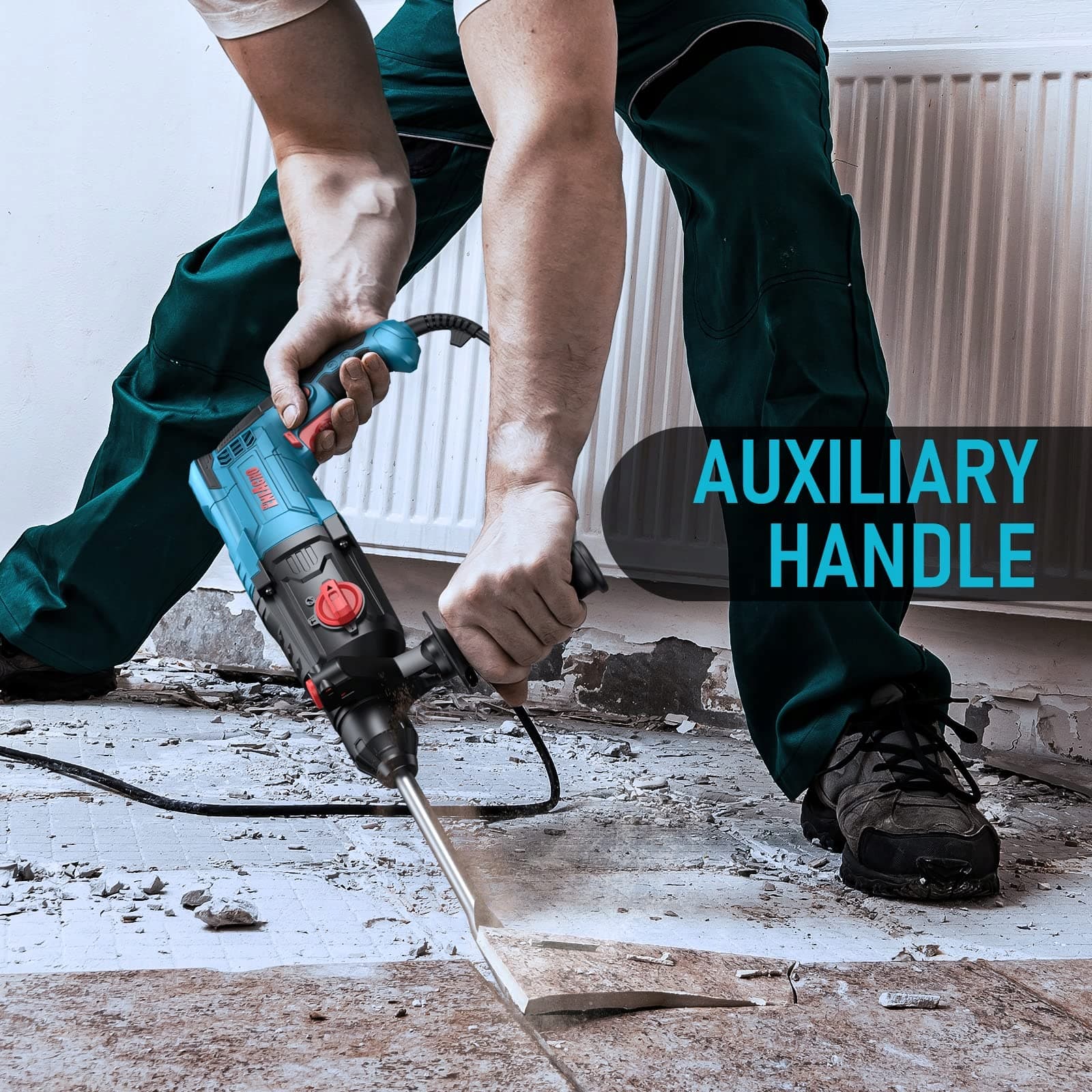 ✅【Bezpieczeństwo i lekkość】Zaprojektowane sprzęgło bezpieczeństwa jest w stanie chronić Twoje nadgarstki, gdy młotowiertarka jest narażona na wysoką siłę momentu obrotowego. Regulowany uchwyt 360° jest odpowiedni do różnych prac. Gumowy uchwyt skutecznie zapobiega poślizgowi i zapewnia lepszy i wygodny chwyt podczas użytkowania. Ta młotowiertarka waży tylko 3,3 kg, dzięki czemu możesz ją łatwo podnieść nad głowę i wykonywać prace sufitowe z łatwością.