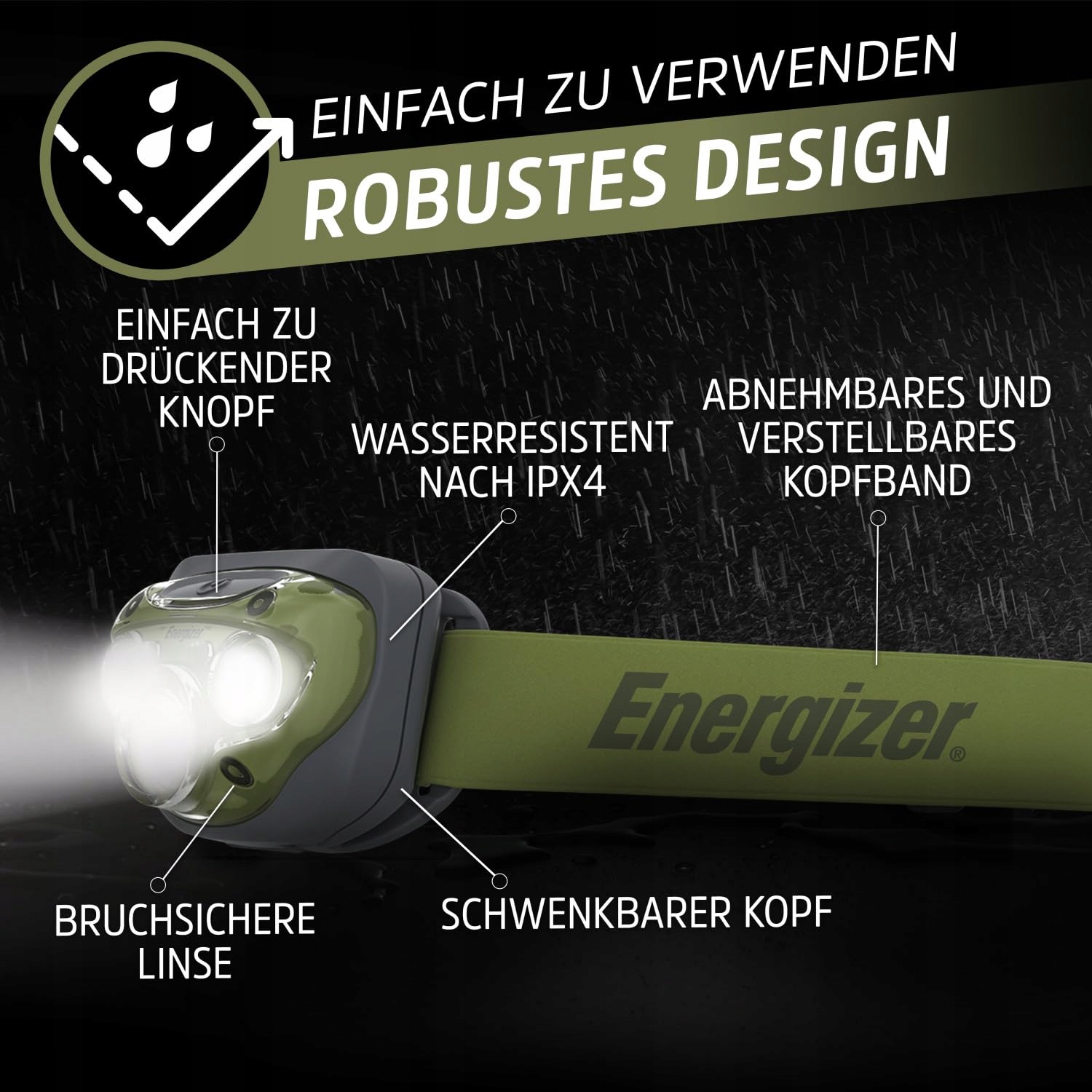 Energizer Vision HD+ 260 lumenów LED latarka czołowa, super jasna latarka na głowę, 7 trybów, wodoodporna IPX4, długi zasięg, idealna na kemping, wędrówki, bieganie, majsterkowanie, jogging, baterie w zestawie, regulowana
