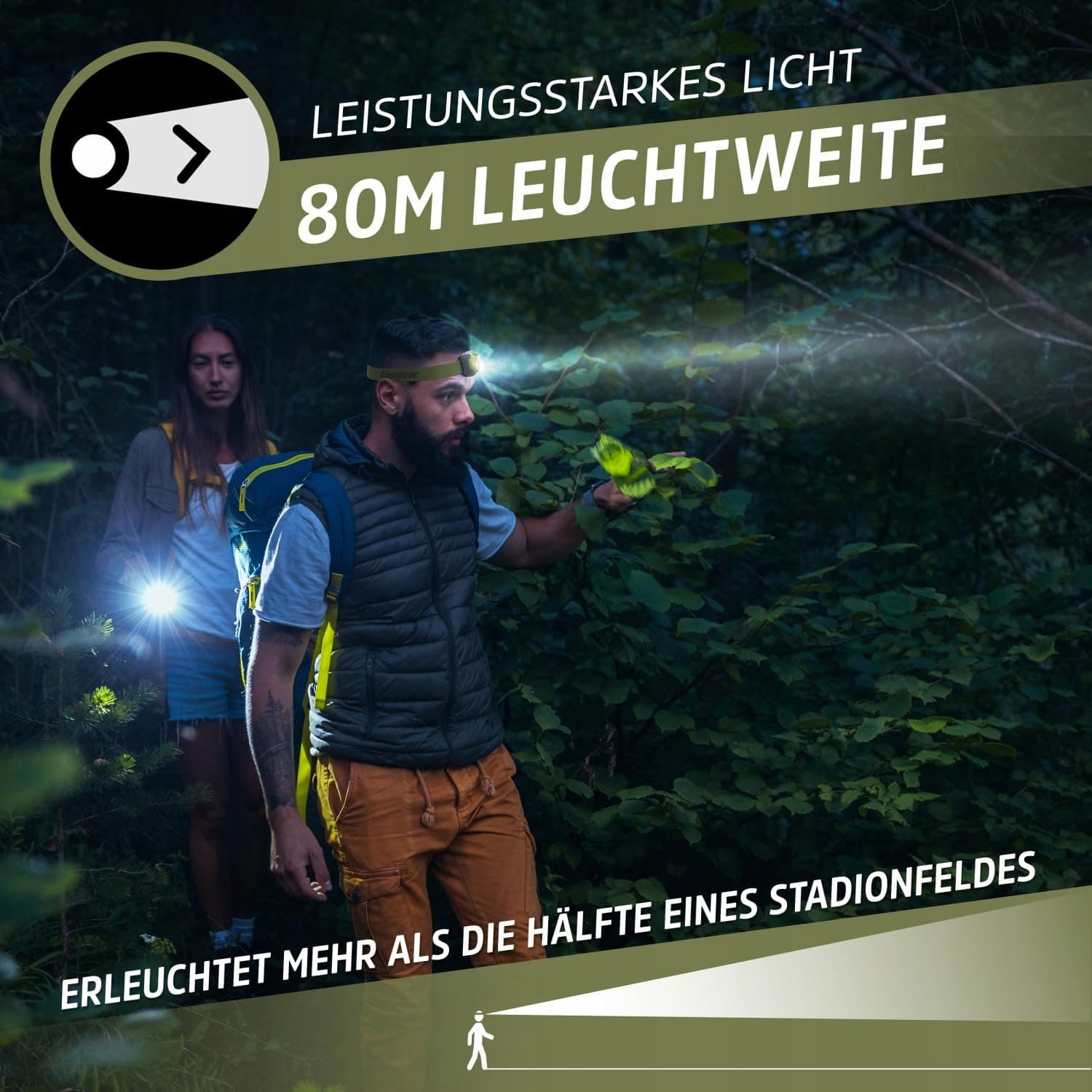 Ultra jasna latarka czołowa LED: Profesjonalna latarka czołowa LED o jasności 260 lumenów, zasięg wiązki do 80 metrów, idealna na nocne wędrówki, kemping, wędrówki, bieganie, spacery z psem i majsterkowanie, doskonałe oświetlenie