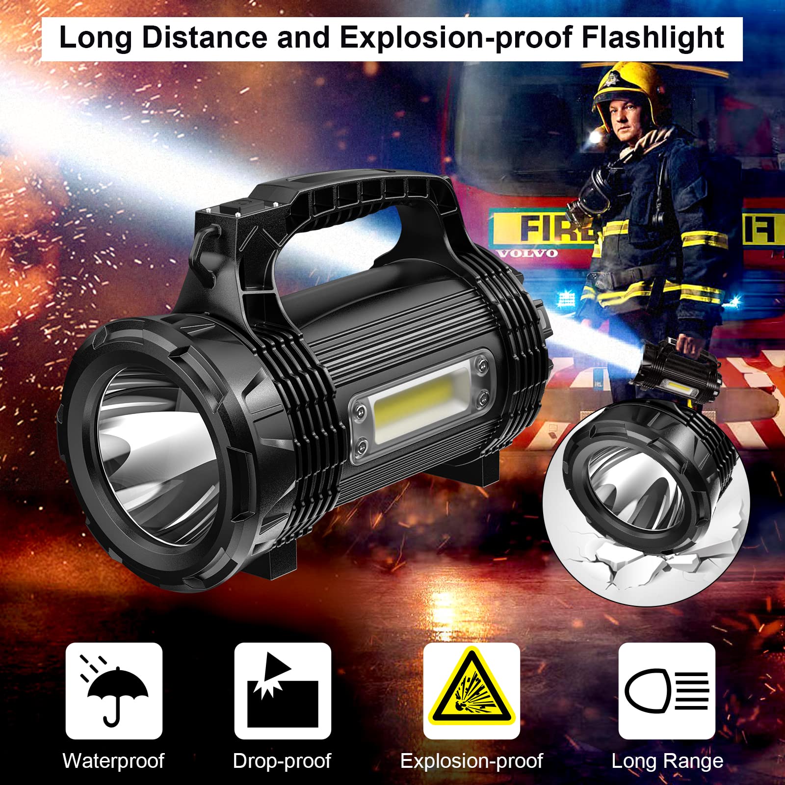 [Wytrzymała i wodoodporna IP65]Wykonana z materiału ABS, ta profesjonalna latarka jest bardzo wytrzymała, odporna na upadki i wstrząsy. Złącza ładowania reflektorów są pokryte wysokiej jakości silikonem, odpowiednie do warunków zewnętrznych i złej pogody.
