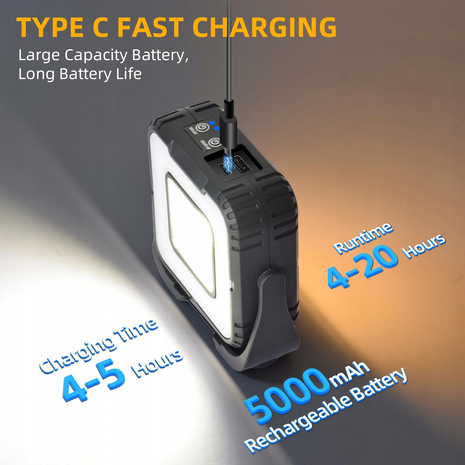 【Akumulator 5000mAh & wskaźnik baterii】: Z wbudowanym akumulatorem 5000mAh, przenośna lampa robocza LED może działać od 4 do 20 godzin, czas ładowania wynosi 4-5 godzin. Posiada również wskaźniki baterii, które pozwalają sprawdzić pozostałą moc i zapewnić terminowe ładowanie. Ponadto może służyć jako powerbank do ładowania urządzeń elektronicznych, takich jak telefony komórkowe, tablety itp.