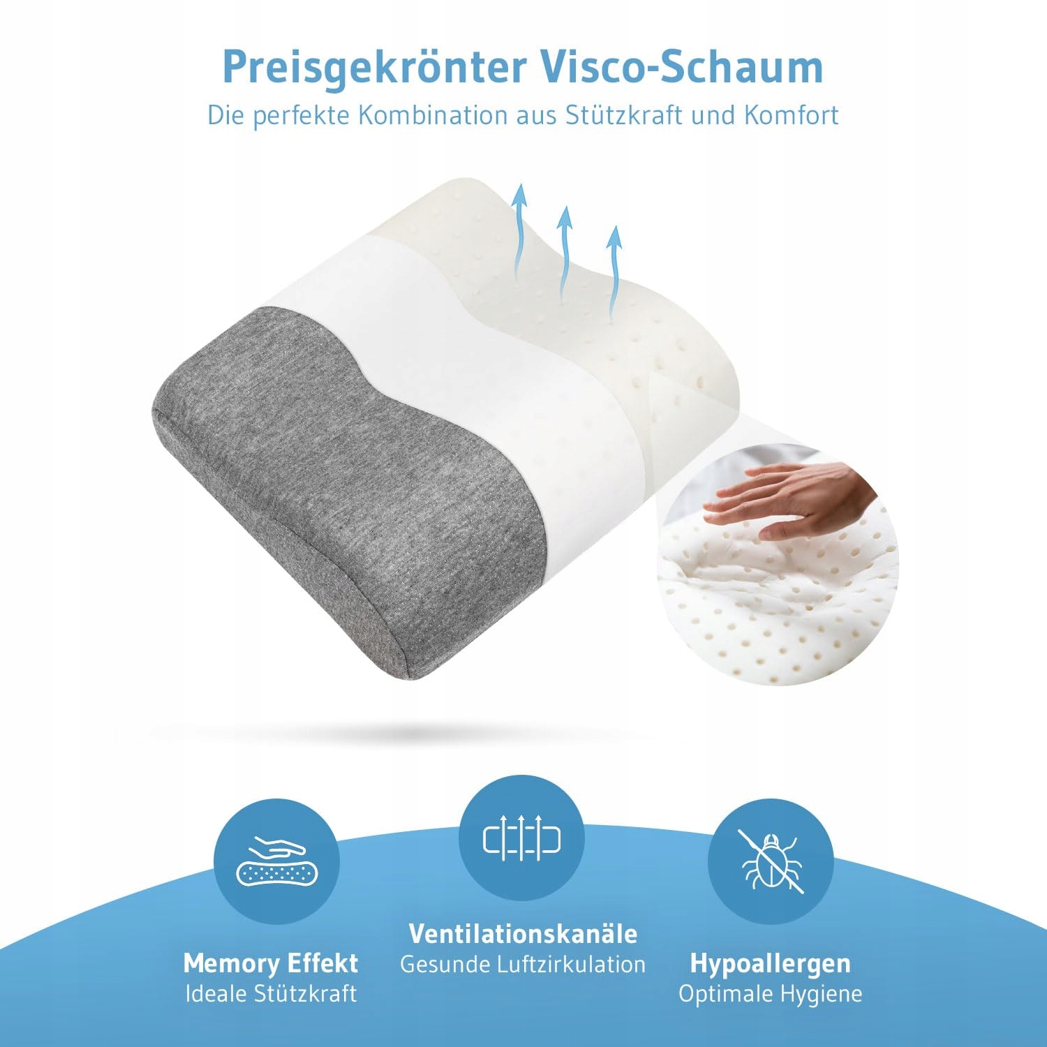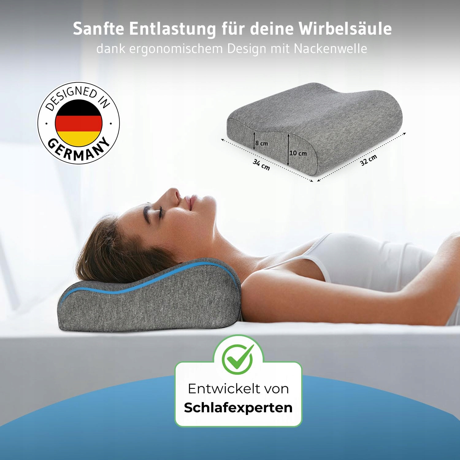 ➥ ERGONOMICZNY DESIGN – specjalnie ukształtowana fala na szyję jest idealna dla osób śpiących na boku i na plecach, wspiera odcinek szyjny kręgosłupa (HWS) podczas siedzenia i skutecznie pomaga zapobiegać napięciom i bólom szyi.