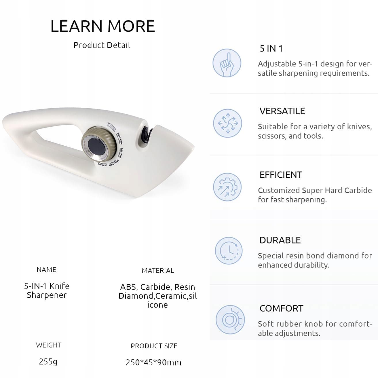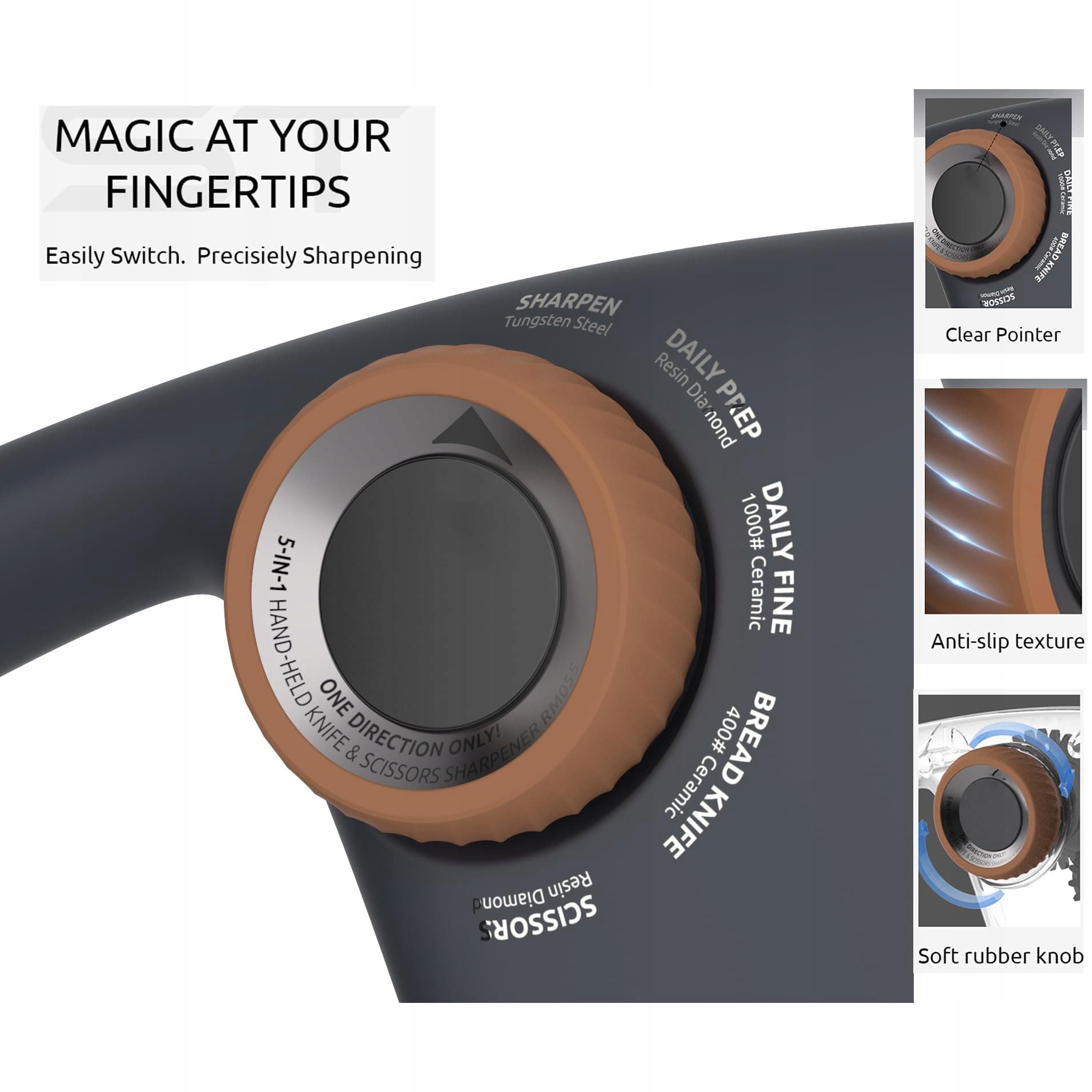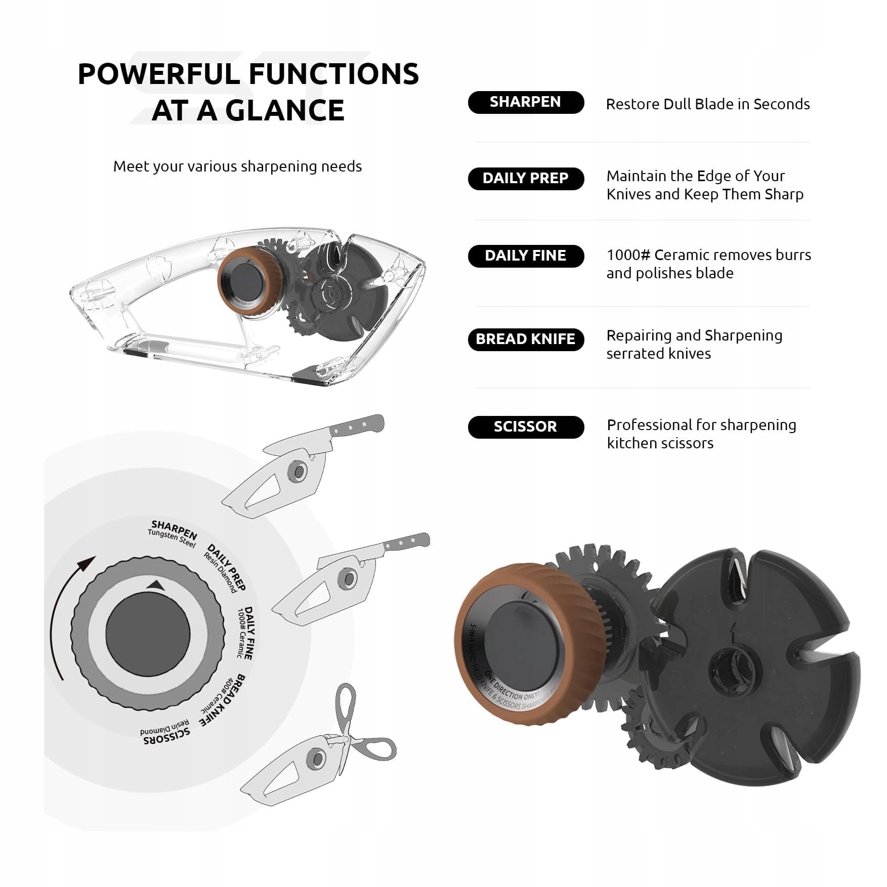 Ostrzenie jak profesjonalista: Nasza ostrzałka do noży kuchennych wykorzystuje wysokiej jakości materiały, takie jak stal tungstenowa, diament z żywicy syntetycznej i ceramika. Po prostu obróć tarczę, a przy użyciu zaledwie kilku lekkich ruchów ustaw, napraw i wypoleruj swoją ostrzałkę do noży na ostry jak brzytwa. Ponadto bez problemu radzi sobie z ząbkowanymi nożami i nożyczkami.