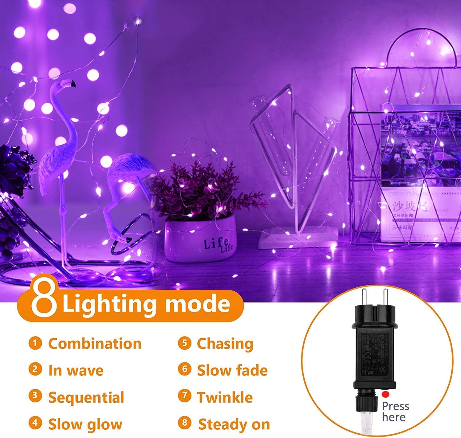 ❤ 8 trybów oświetlenia ♥ -- Kombinacja, W falach, Sekwencyjnie, Slo-Glo, Chaing / Flash, Powolne blaknięcie, Migotanie / Flash, Stałe światło. Łańcuchy świetlne są elastyczne i giętkie. Miedziany drut można w kreatywny sposób łatwo samodzielnie formować. Po prostu zaprojektuj to według swojej inspiracji wokół roślin, balkonów, ram, schodów, mebli i prawie wszystkiego innego.