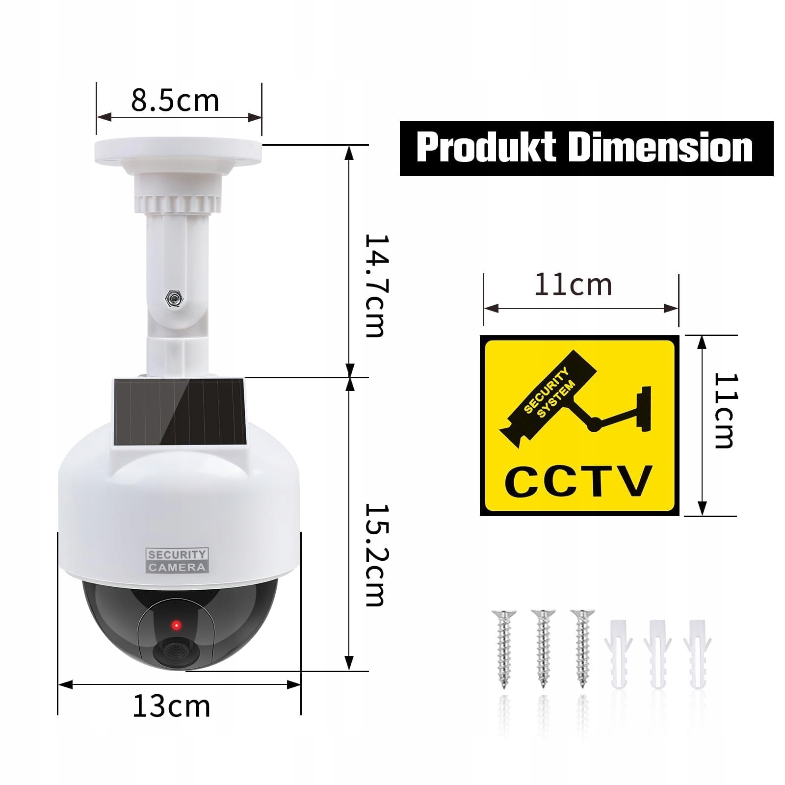 W zestawie: 1 x Dummy Kamera Solar (biała), 3 x śruby, 1 x naklejka ostrzegawcza.