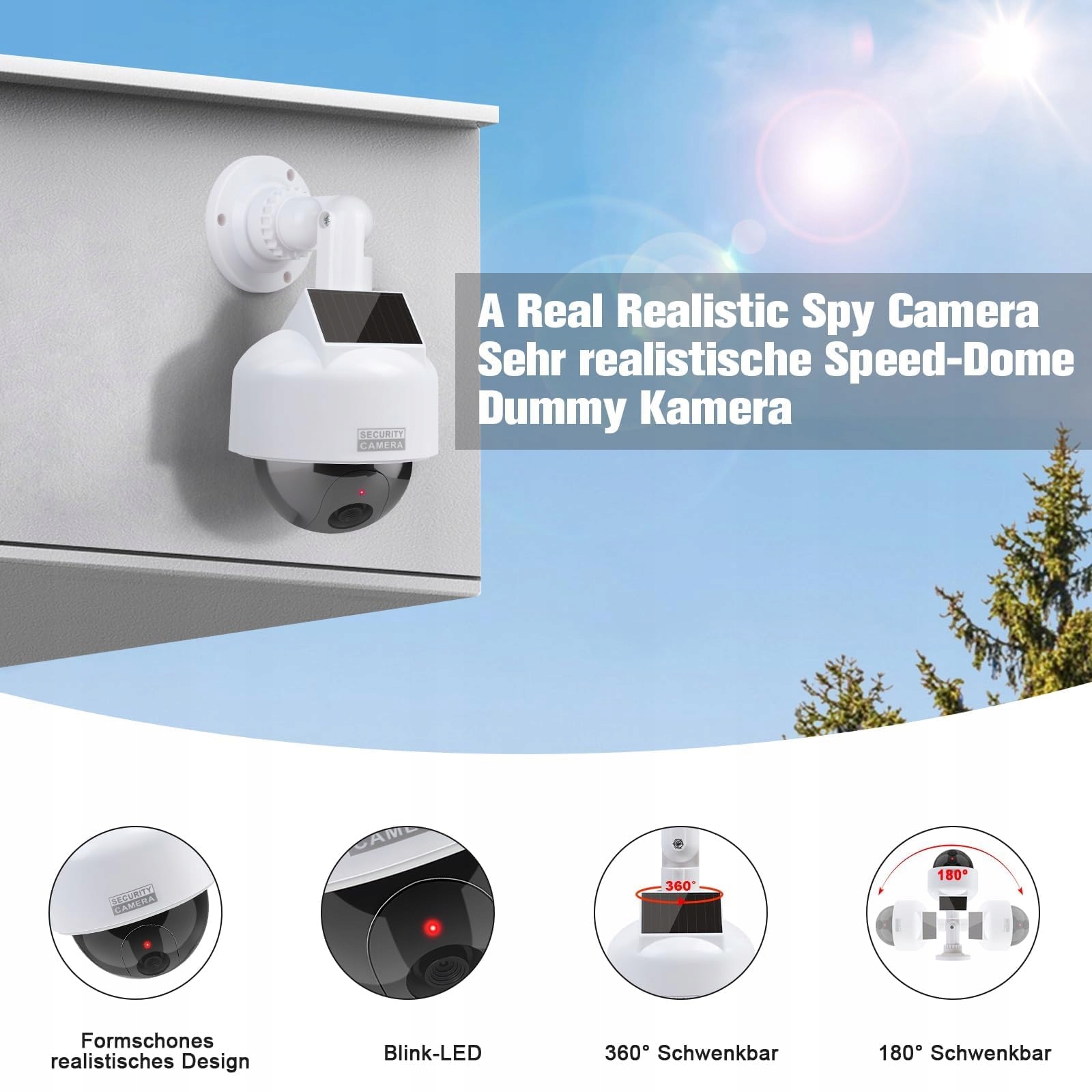 Elegancki design: Uchwyt regulowany o 360 stopni, działa na energię słoneczną i 2 baterie AA (nie w zestawie), automatycznie się przełącza, bardzo odstraszający z obiektywem i migającą diodą LED.