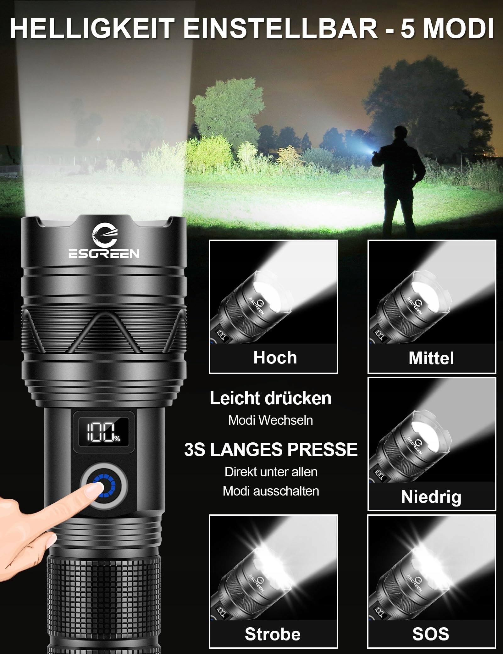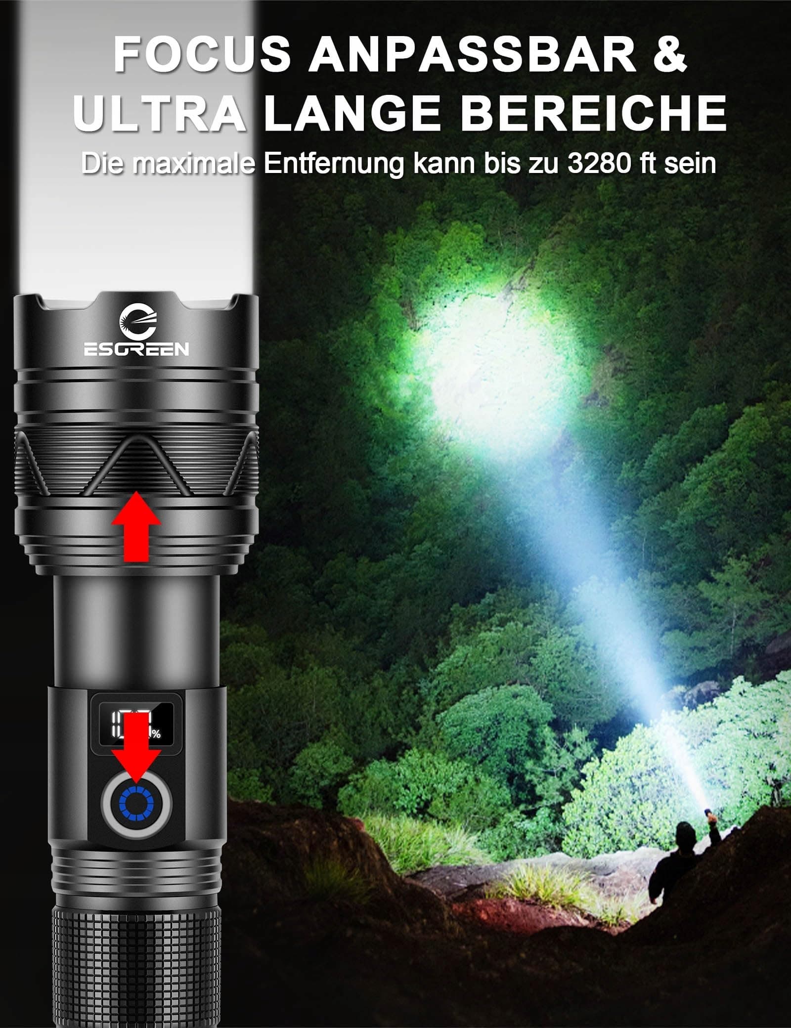 [ Ulepszona Ekstremalnie Jasna & Długi Zasięg LED ] Latarki ESGREEN ED0330 naładowane składają się z ulepszonej diody LED PH-L330 30W, która charakteryzuje się wysoką jasnością i ultra długim promieniem. Oferuje maksymalną moc 500000 lumenów, co pozwala łatwo oświetlić cały pokój i ogród. Ultrajasny promień zapewnia wysoko skoncentrowany okrągły strumień, dzięki czemu można łatwo i wyraźnie skupić się na obiektach oddalonych o 3280 stóp. Idealna do campingu, wędrówek, spacerów z psem, jazdy konnej lub przygód na świeżym powietrzu oraz w sytuacjach awaryjnych.