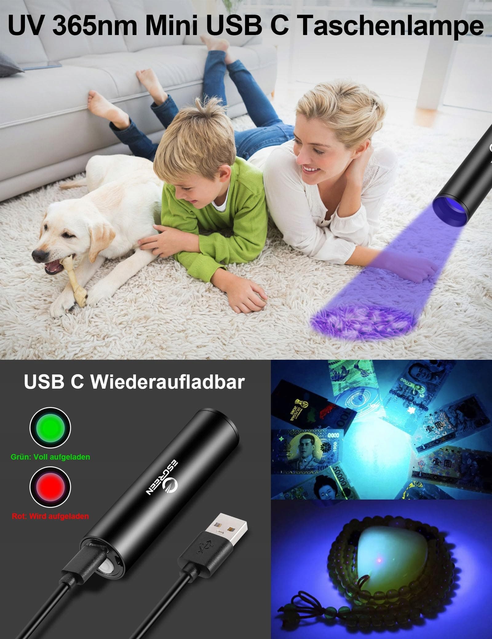 ESGREEN Latarka LED Ekstremalnie Jasna 500000 Lumenów Długi Zasięg, Ładowana przez USB C Takticzna Mocna Latarka z Wysoką Pojemnością Akumulatora, Zoomowalna 5 Trybów Duża Latarka do Campingu i Bezpieczeństwa