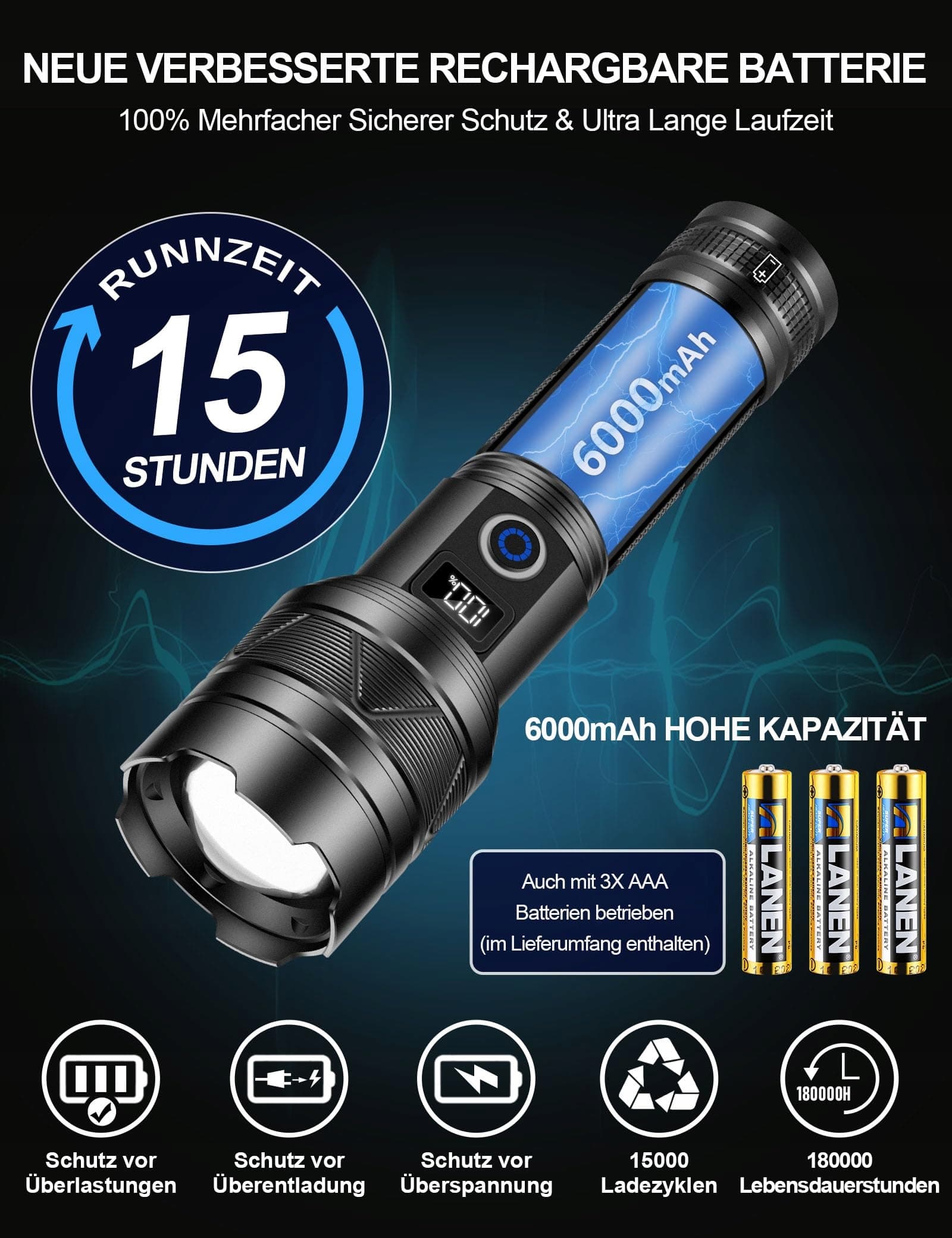 [ Długotrwała i ochrona przed przeładowaniem ] Latarka jest wyposażona w akumulator 1 szt. 6000mAh, dzięki czemu może zapewnić do 15 godzin intensywnego i nieprzerwanego światła. Zarówno bateria, jak i latarka są zintegrowane z inteligentnym chipem, który ma funkcję ochrony przed przeładowaniem, aby zapewnić bezpieczeństwo.