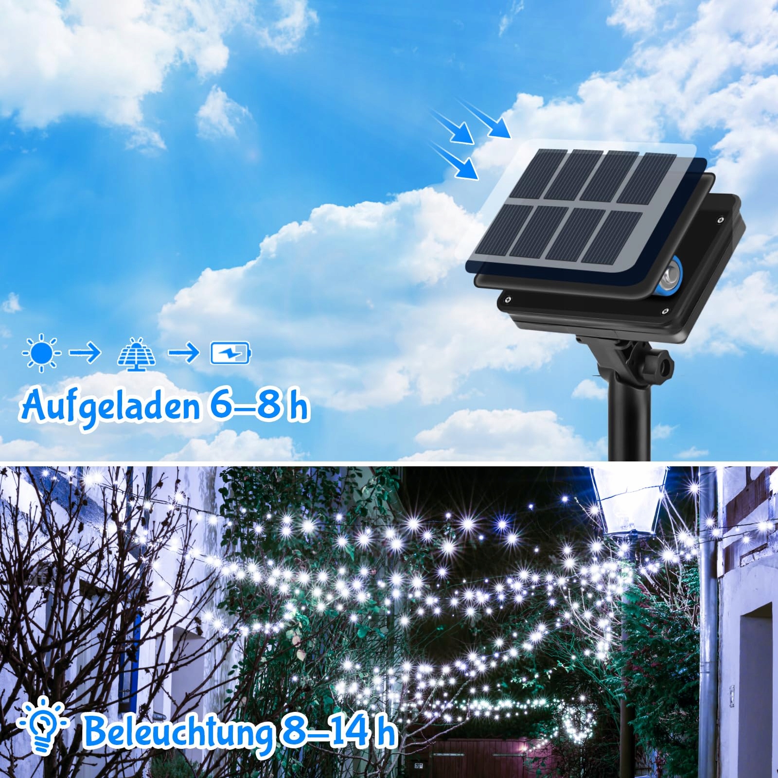 [12M 120LED Solarne Lampki Zewnętrzne]12M 120LED Solarne Lampki Zewnętrzne Odporne na Warunki Atmosferyczne mają długość 14M (z 2M przewodami zasilającymi), zawierają 120 koralików świetlnych, które łatwo udekorują Twój ogród, balkon, taras, poręcze, tworząc fantastyczną atmosferę. Solarne lampki są wykonane z wysokiej jakości materiału drutowego, owiniętego PVC wokół drutu i koralików, co sprawia, że nie łamią się łatwo podczas użytkowania.