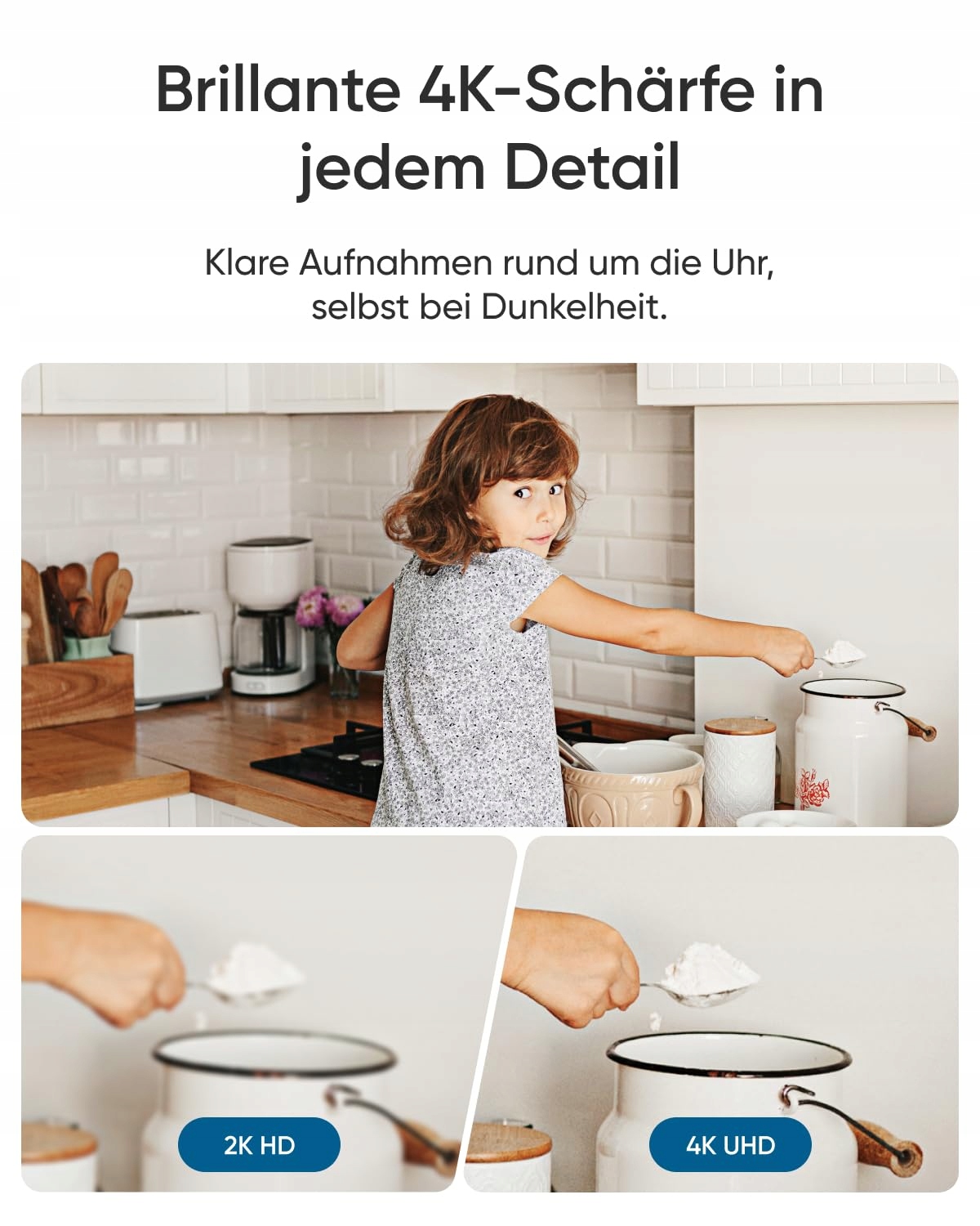 Całodobowe krystalicznie czyste nagrania: Doświadcz monitoringu 24/7 w imponującym 4K. Dzięki wbudowanej funkcji dwukierunkowego audio możesz w każdej chwili komunikować się z rodziną na żywo.
