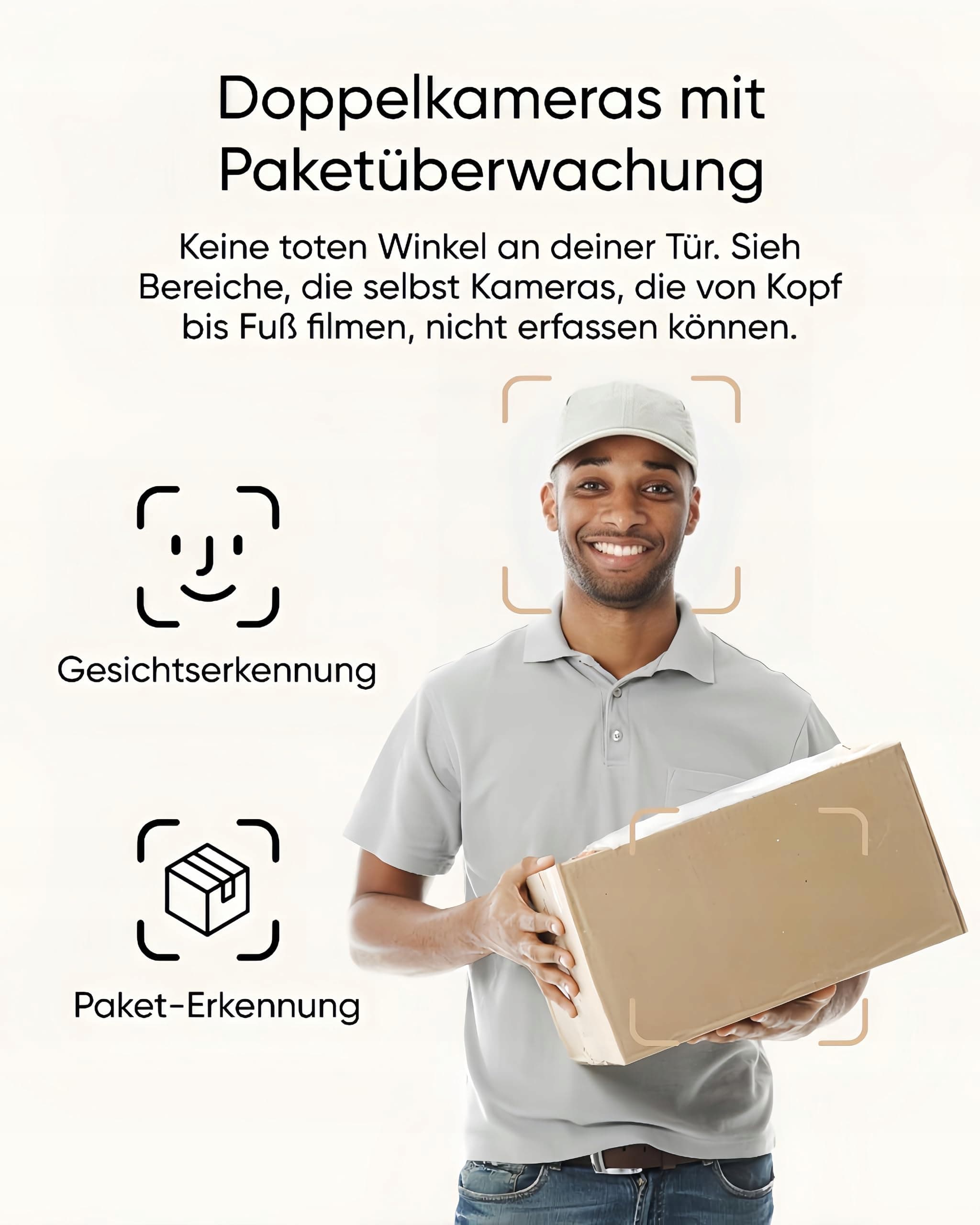 DWA KAMERY, PODWÓJNE BEZPIECZEŃSTWO: Dwie kamery uzupełniają się, zapewniając rozszerzony widok. Kamera przednia skupia się na osobach, podczas gdy kamera skierowana w dół obserwuje teren przed twoimi drzwiami.