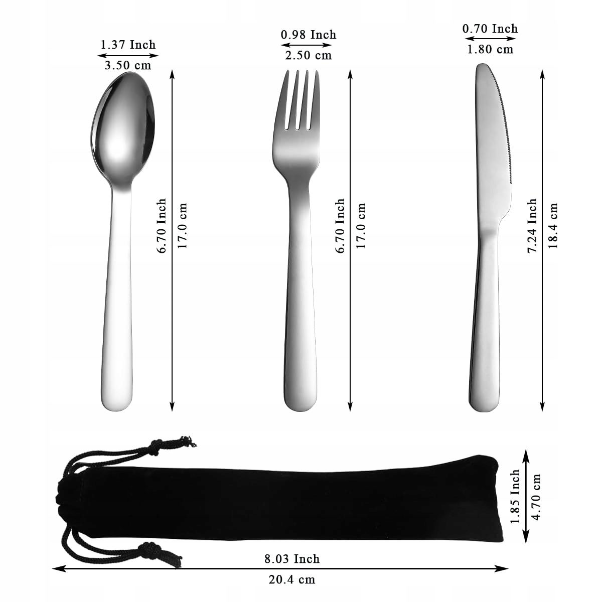 Evanda sztućce kempingowe, w tym nóż, widelec, łyżka, stalowe sztućce podróżne z czarną torbą, na zewnątrz, piknik, kemping, podróże, nadające się do mycia w zmywarce