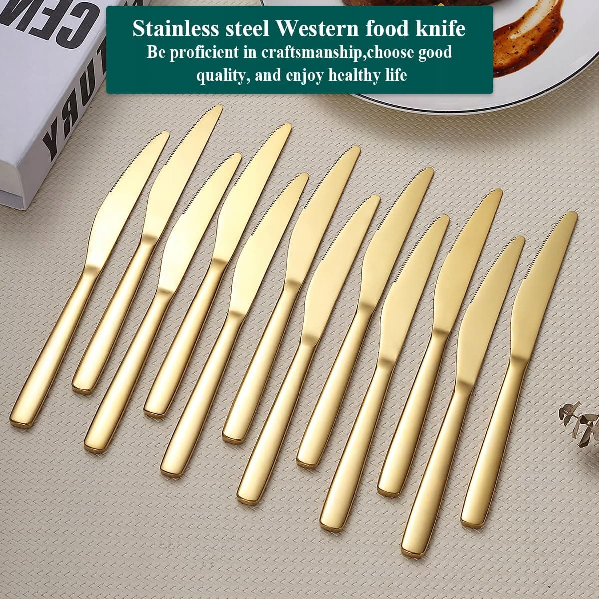 EVANDA Zestaw Noży Stołowych 12 Sztuk Tytanowe Złote Stal Nierdzewna