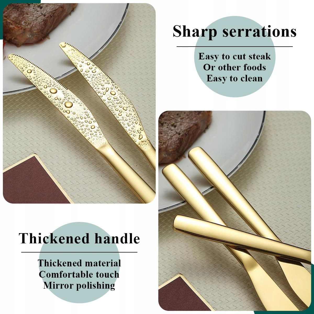 Noże mają odpowiednią wagę i rozmiar, dobrze leżą w dłoni i posiadają ostry ząbkowany brzeg, dzięki któremu łatwo pokroisz steki, nie raniąc się, co pozwala bezpiecznie i łatwo cieszyć się kolacją.