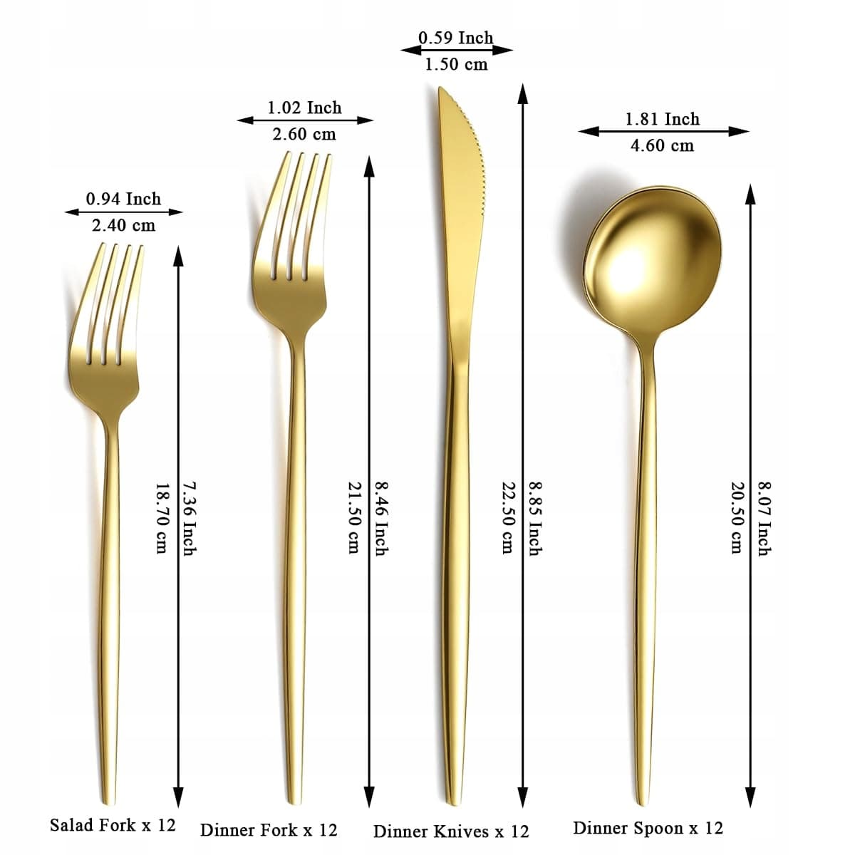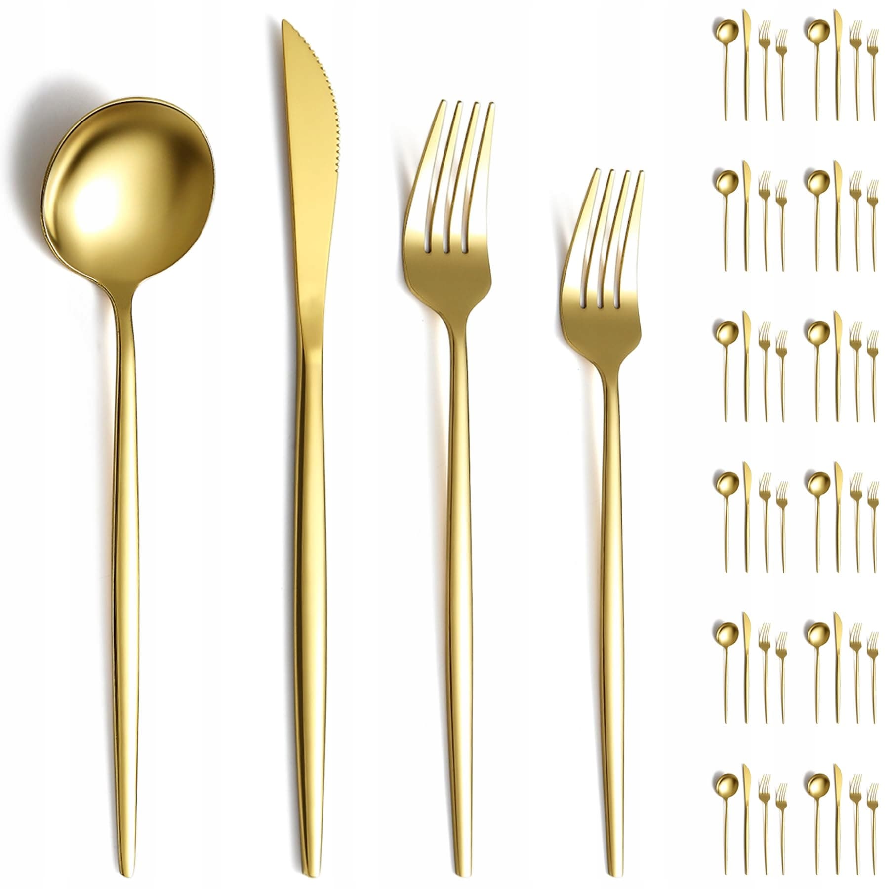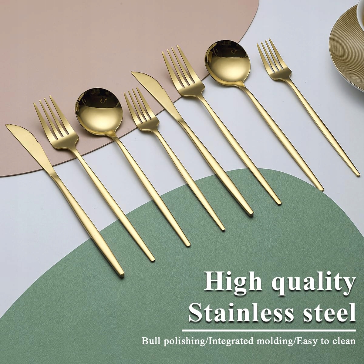 Te wszechstronne sztućce ze stali nierdzewnej mają błyszczące wykończenie i gładkie krawędzie, a pozłacenie całego zestawu sprawia, że jest jeszcze bardziej luksusowy.
