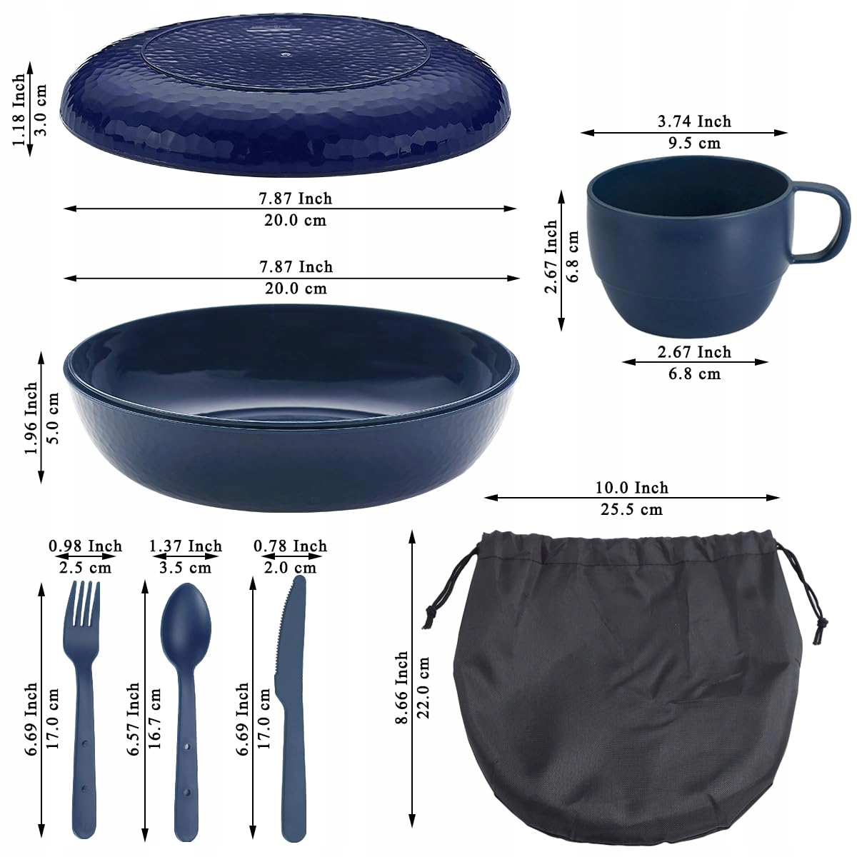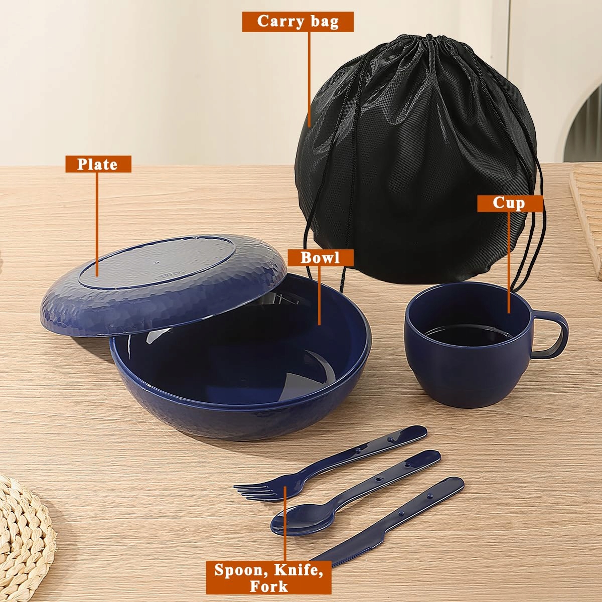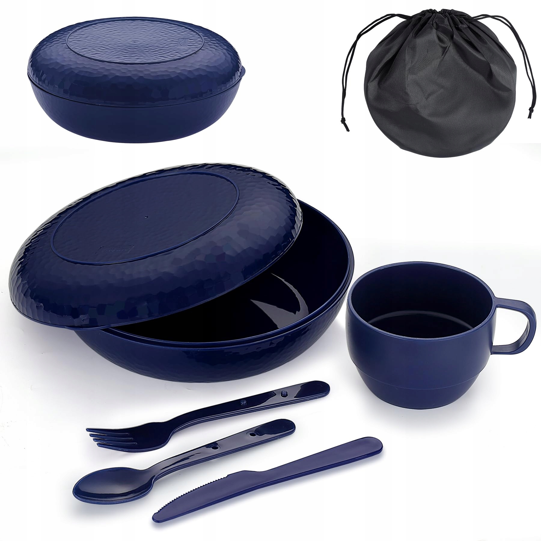 Evanda Camping sztućce, talerz, kubek, łyżka, widelec, nóż i torba na ramię, wielorazowe akcesoria kempingowe, niezbędne wyposażenie, lekkie i łatwe do przenoszenia lub schowania do plecaka