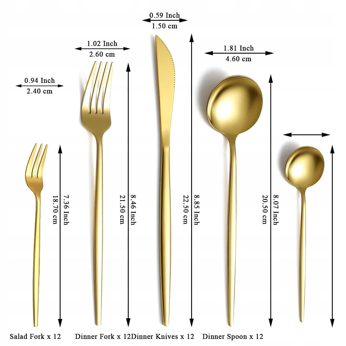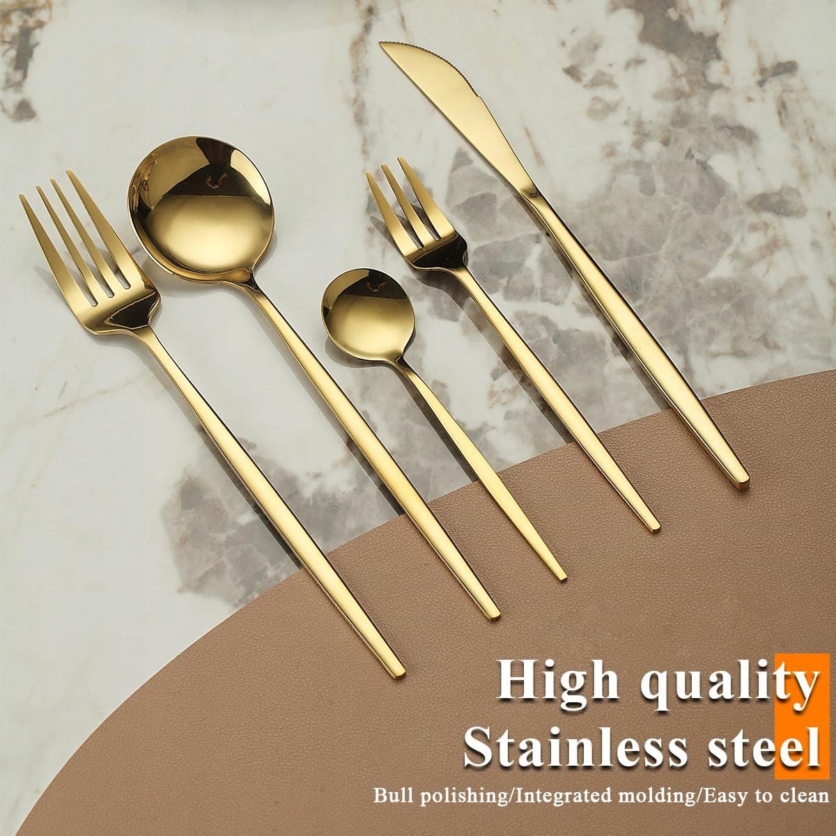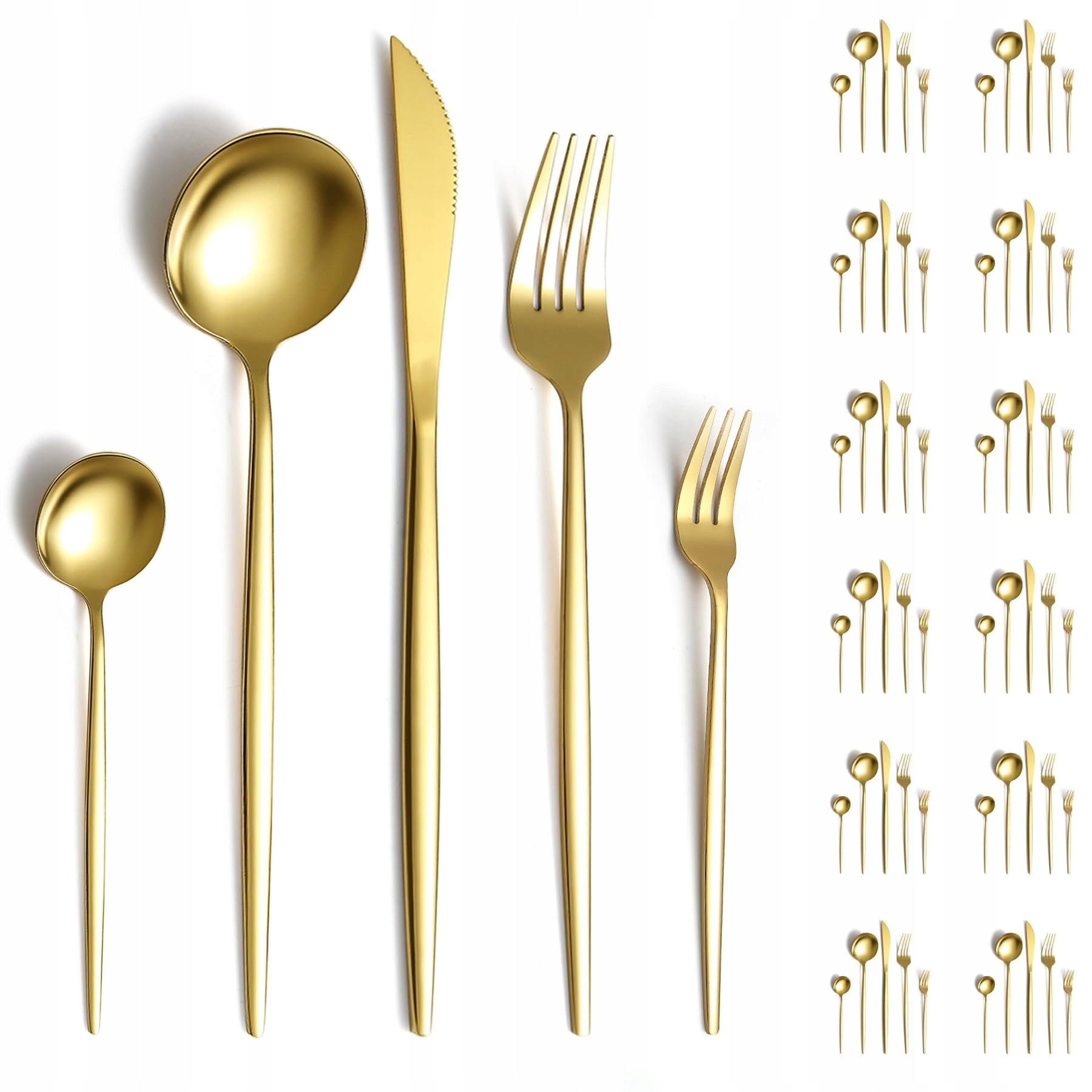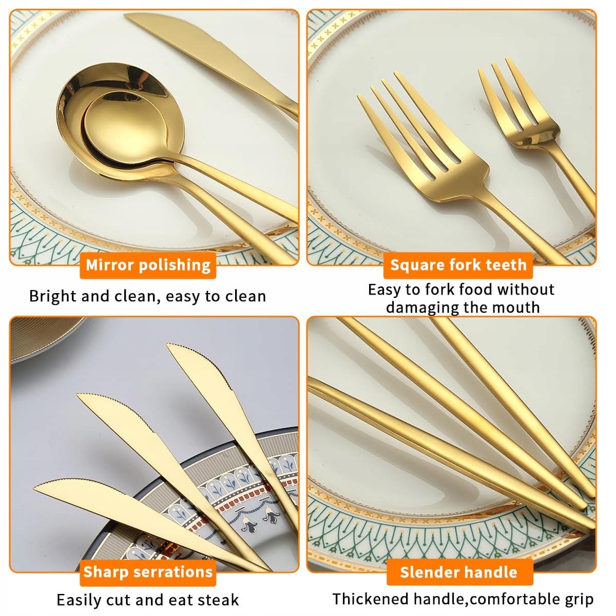 Ten wszechstronny zestaw sztućców ze stali nierdzewnej jest pokryty błyszczącym, wysokopołyskowym wykończeniem i gładko wypolerowanymi krawędziami, a pozłacanie całego zestawu czyni go jeszcze bardziej luksusowym.