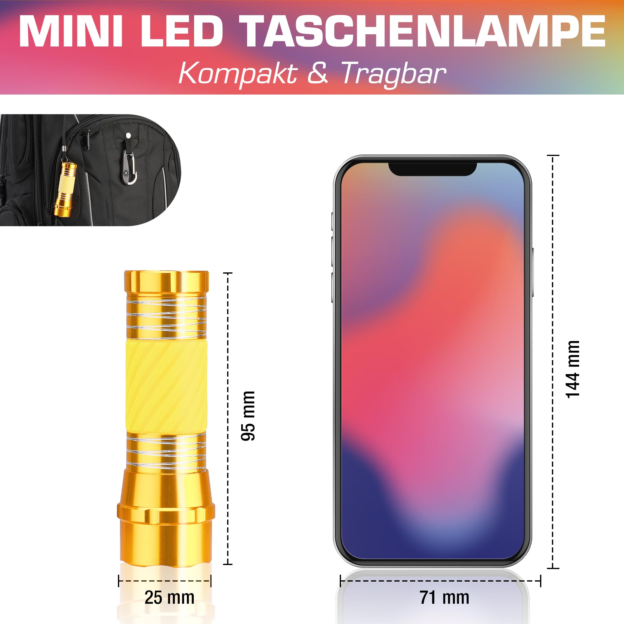 【Kolorowa obudowa aluminiowa】 Latarka LED jest solidna, odporna na zużycie i ma dłuższą żywotność. Latarka dostępna w 4 kolorach: zielonym, żółtym, niebieskim i różowym.