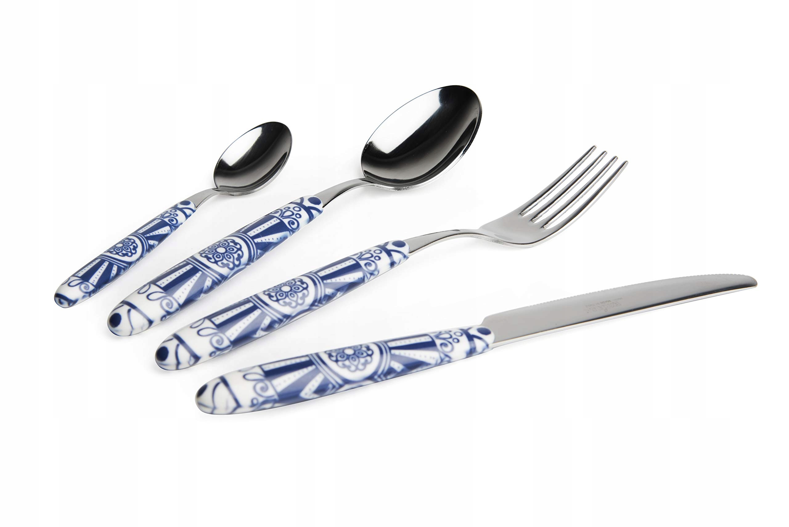 Zestaw sztućców Boheme Blue wykonany jest z wysokiej jakości stali nierdzewnej z uchwytem z tworzywa PE; składa się z 24 części: 6 noży, 6 łyżek, 6 widelców i 6 łyżeczek do kawy; wyprodukowany we Włoszech, bezpieczny dla żywności