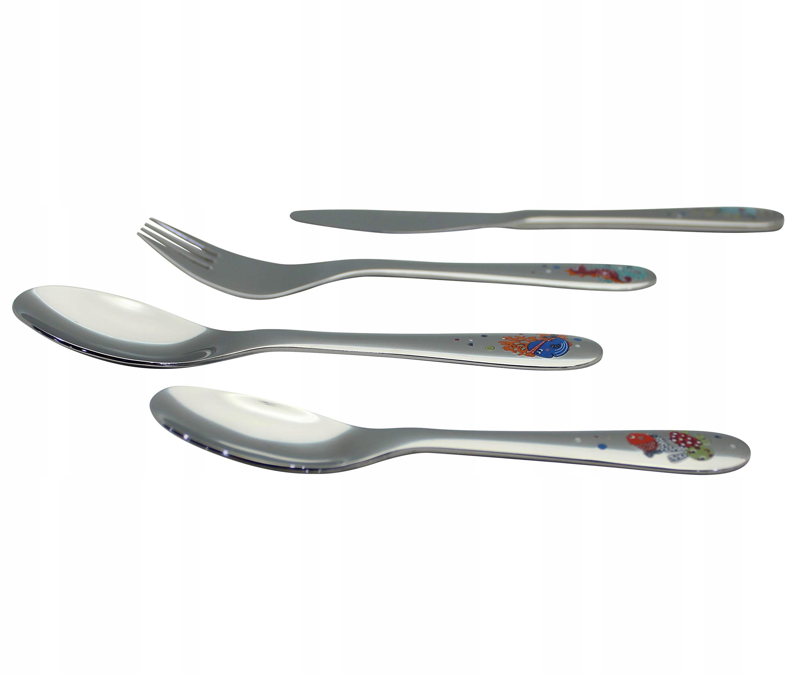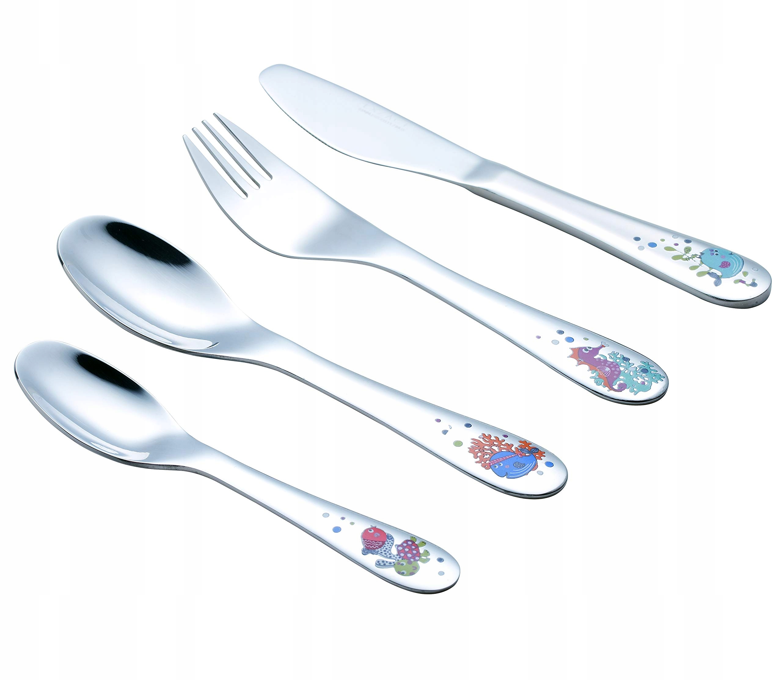 Exzact dziecięce sztućce 4-częściowe ze stali nierdzewnej - 1 x nóż stołowy, 1 x widelec stołowy, 1 x łyżeczka i 1 x łyżka stołowa. - niezależna seria projektantów. Urocze zwierzęta morskie, polerowane na lustro. (WF712-4SEA)