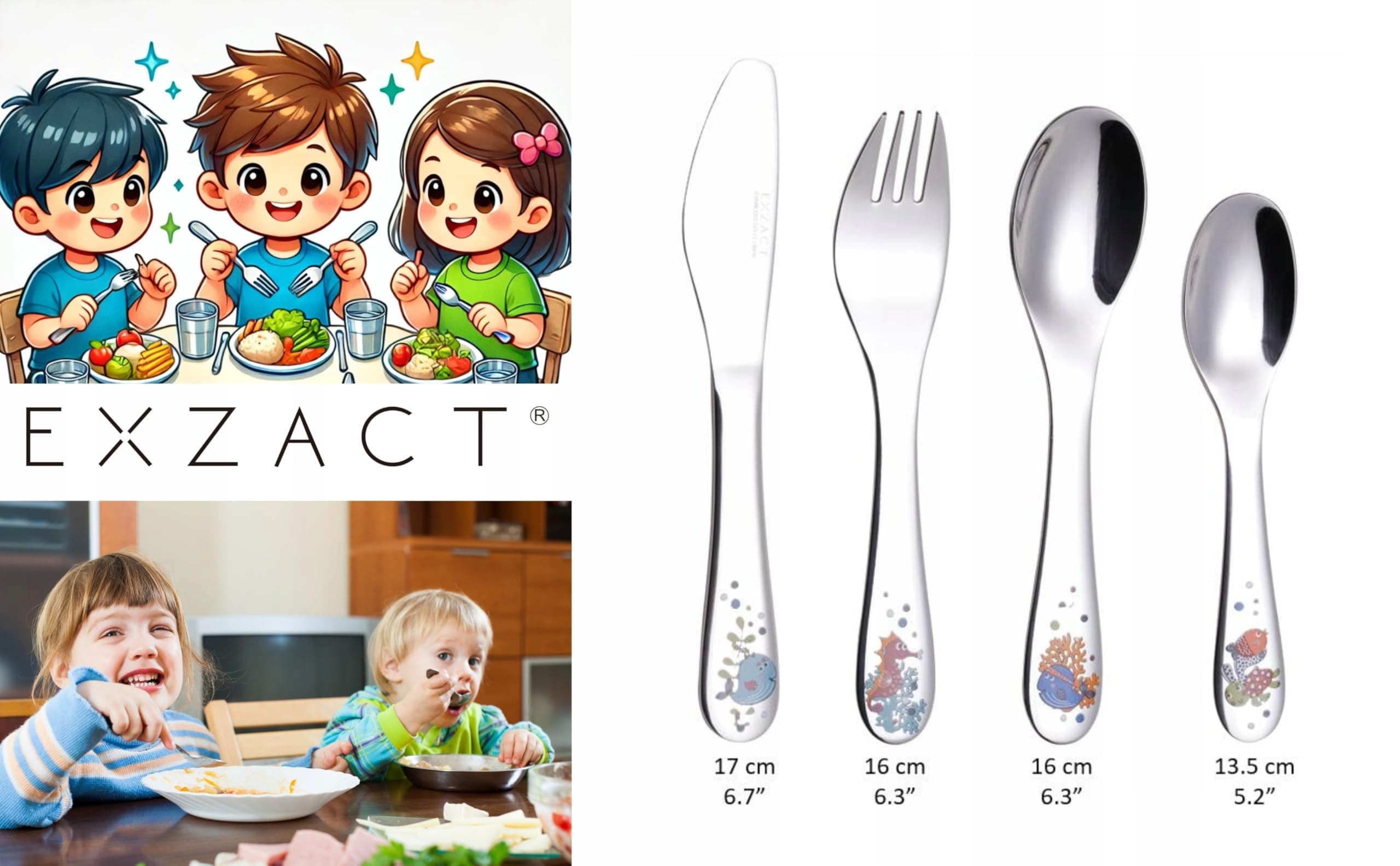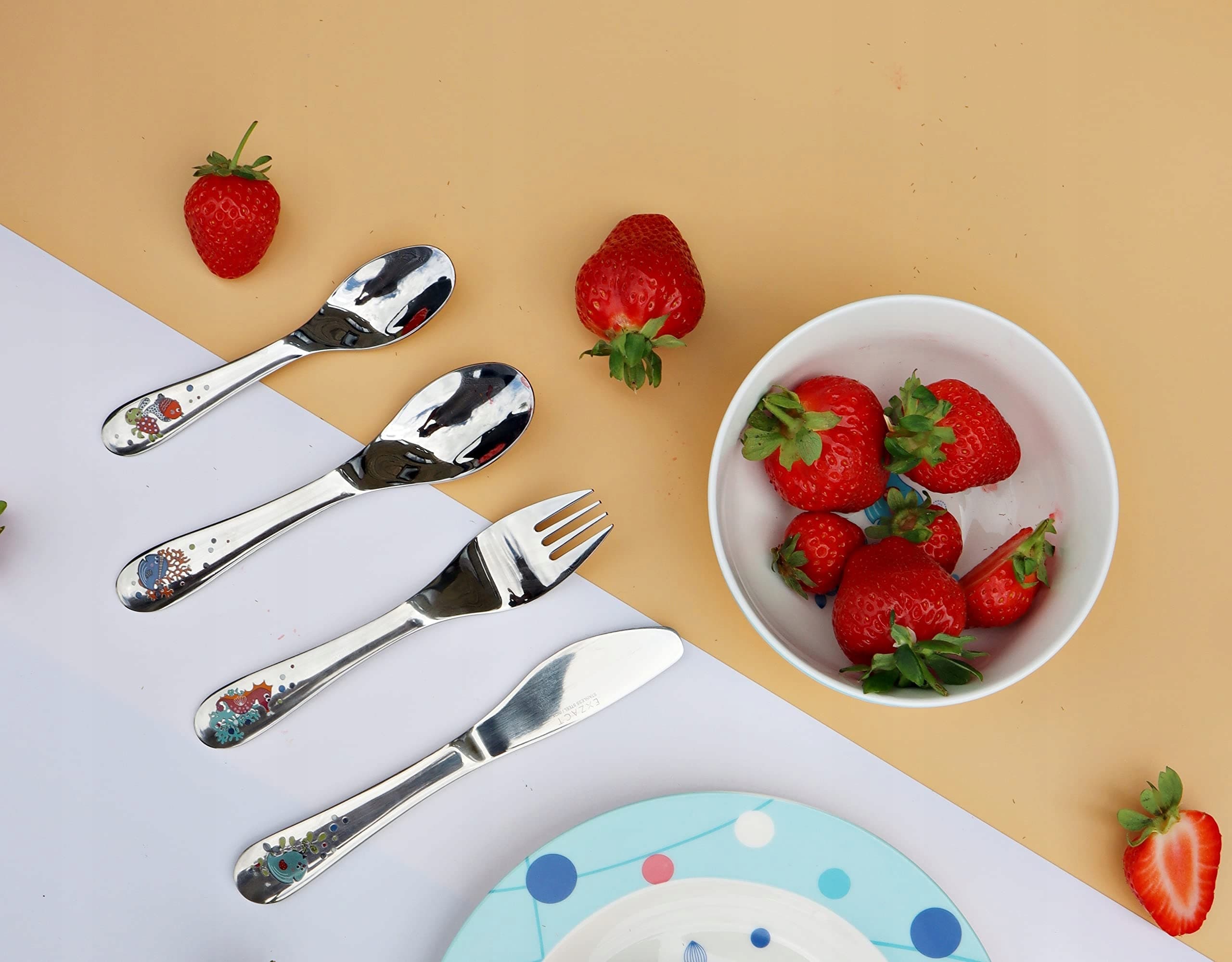 Exzact wysokiej jakości dziecięce sztućce, 1 x nóż stołowy, 1 x widelec do jedzenia, 1 x łyżeczka i 1 x łyżka do jedzenia. Wszystko w rozmiarze dziecięcym i przyjaznym dla dzieci kształcie.