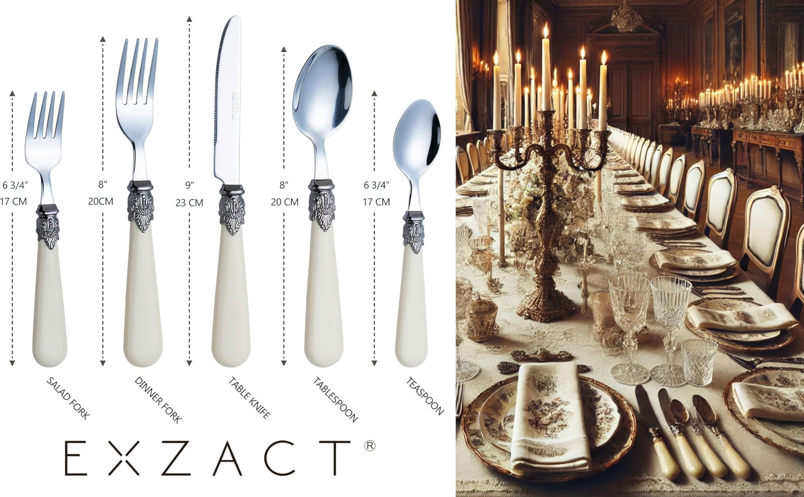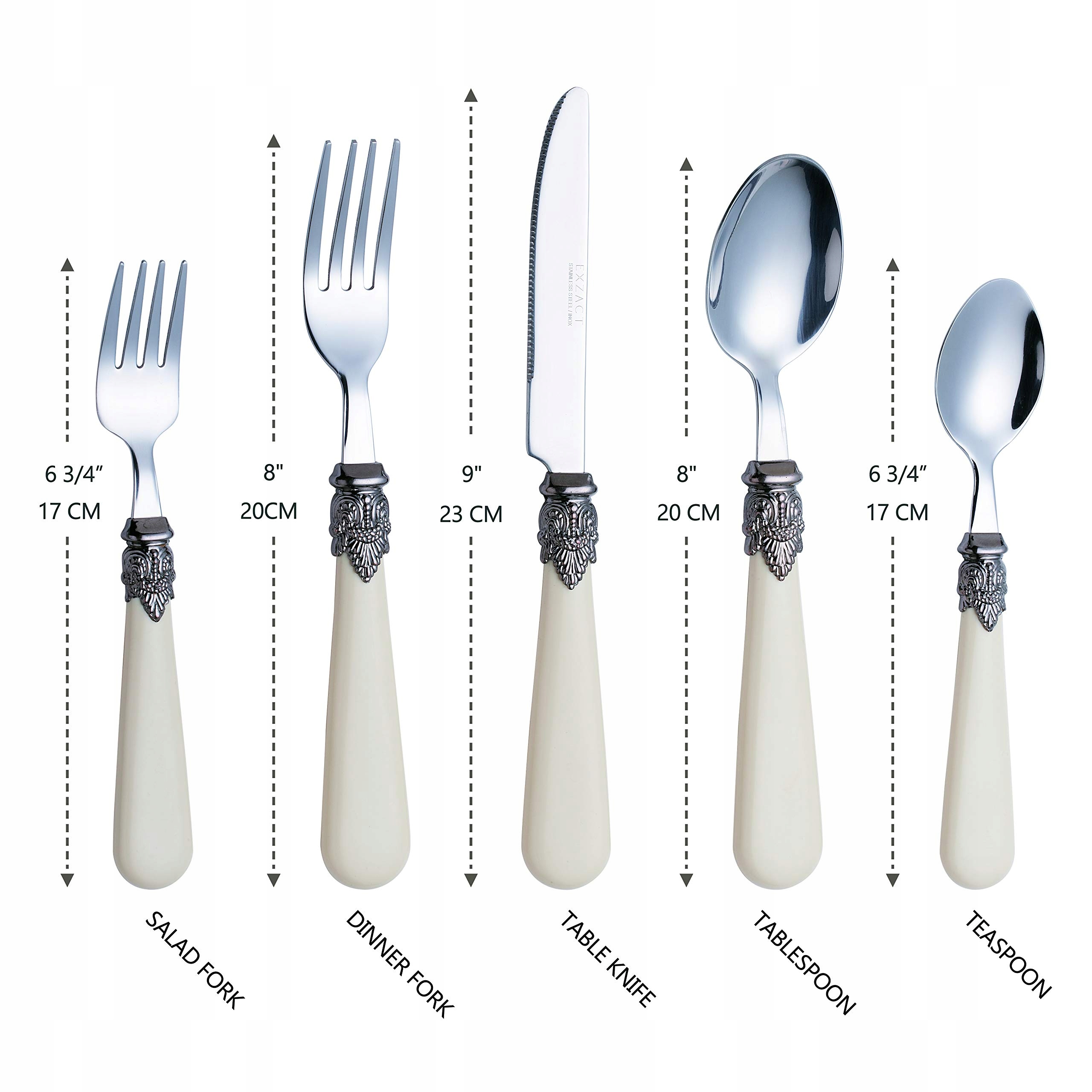 EXZACT zestaw sztućców ze stali nierdzewnej 20-częściowy, w tym 4 x widelce do obiadu, 4 x widelce do sałatek, 4 x noże do obiadu, 4 x łyżeczki do herbaty oraz 4 x łyżki stołowe. W kolorze kremu kości słoniowej, z pięknie grawerowanymi detalami;