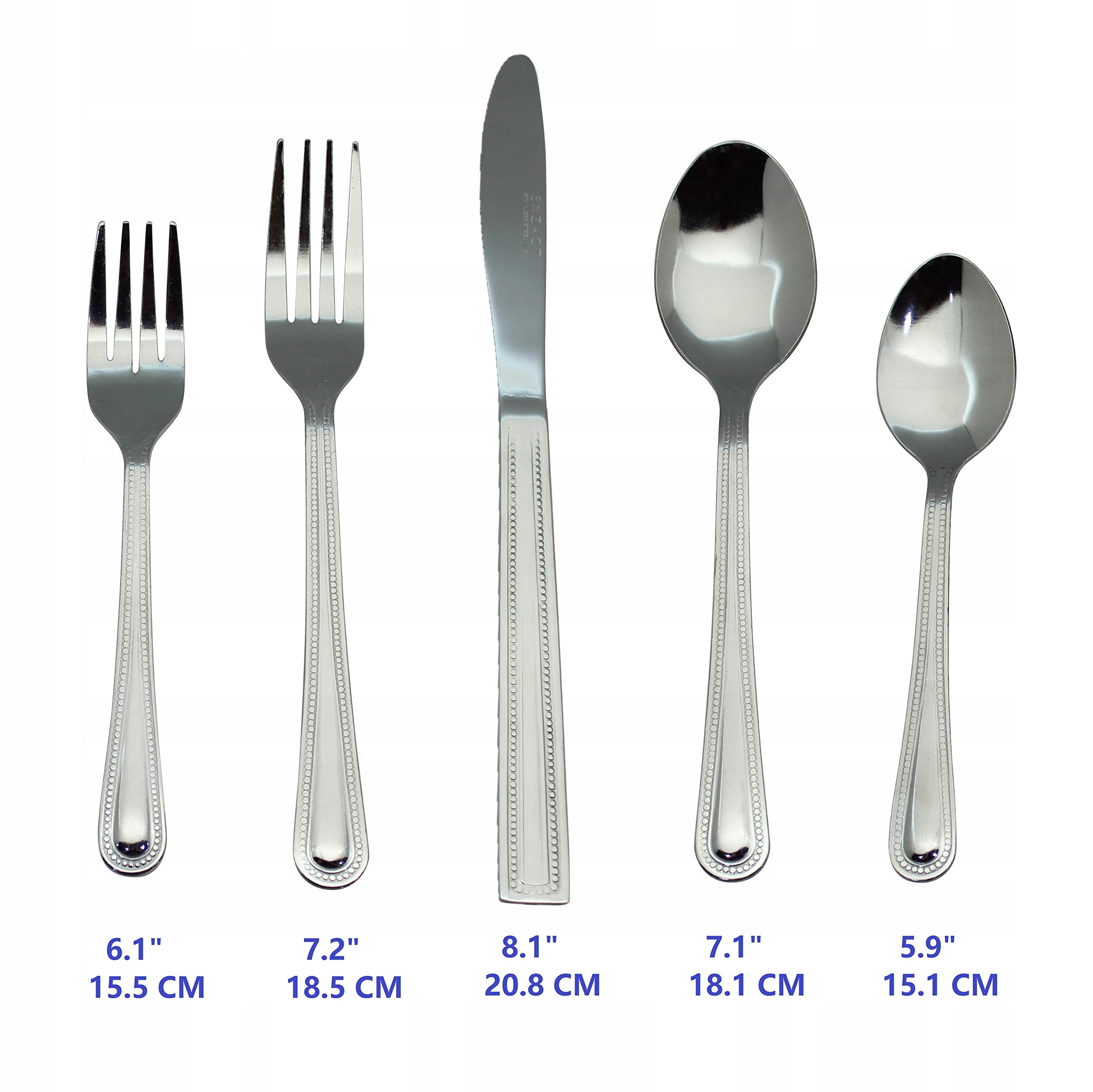 Długość: nóż 20,8 cm, widelec 18,5 cm, widelec do sałaty 15,5 cm, łyżka stołowa 18,1 cm, łyżeczka 15,1 cm.