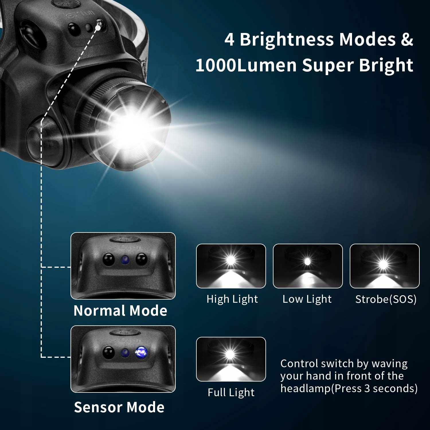 [STEROWANIE CZUJNIKIEM]oprócz możliwości kontroli za pomocą manualnego przełącznika, ta wodoodporna latarka LED ma inny tryb czujnika. W trybie czujnika latarka automatycznie włącza się, gdy wykryje obiekty. Możesz nią sterować, machając ręką lub przesuwając ją przed innymi obiektami. Funkcja detekcji jest bardziej wrażliwa, gdy potrząsasz rękami w odległości 5-15 cm od czoła. Kąt wykrywania wynosi 120 stopni.