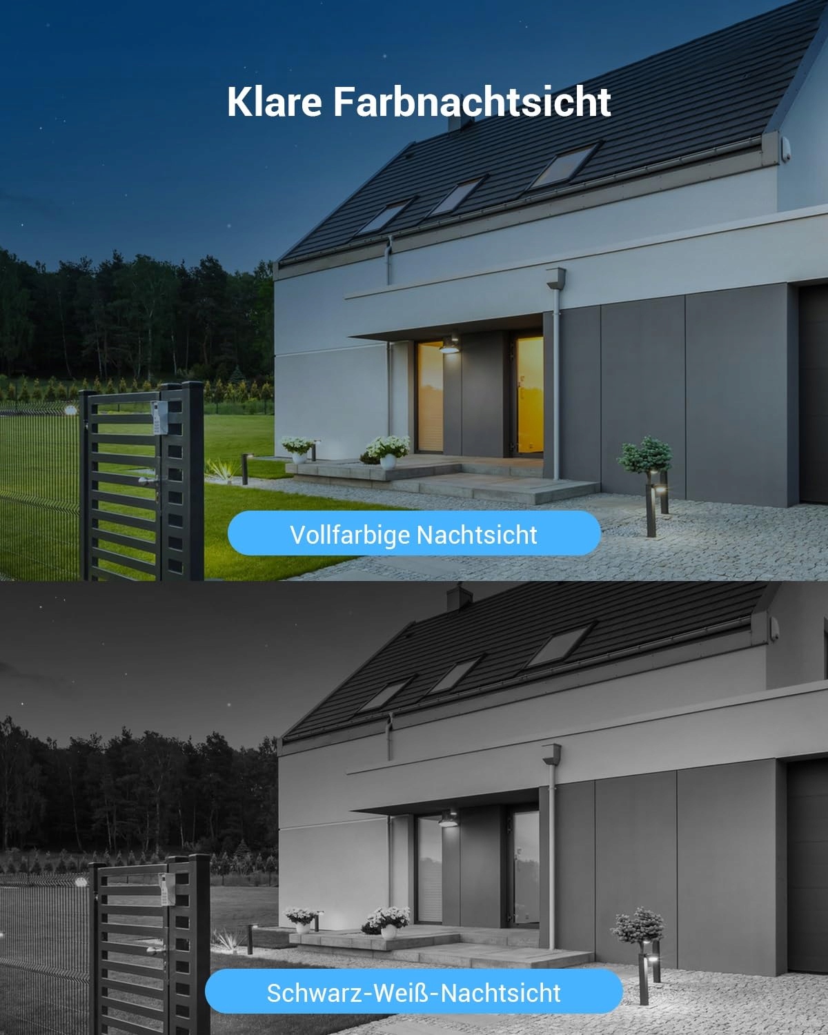 Rozdzielczość 2K i kolorowe widzenie nocne: Ta kamera do monitoringu na zewnątrz rejestruje żywe obrazy w ultraczystej rozdzielczości 2K. W nocy kamera WLAN oświetla otoczenie wbudowanym reflektorem, aby nagrywać pełnokolorowe obrazy.