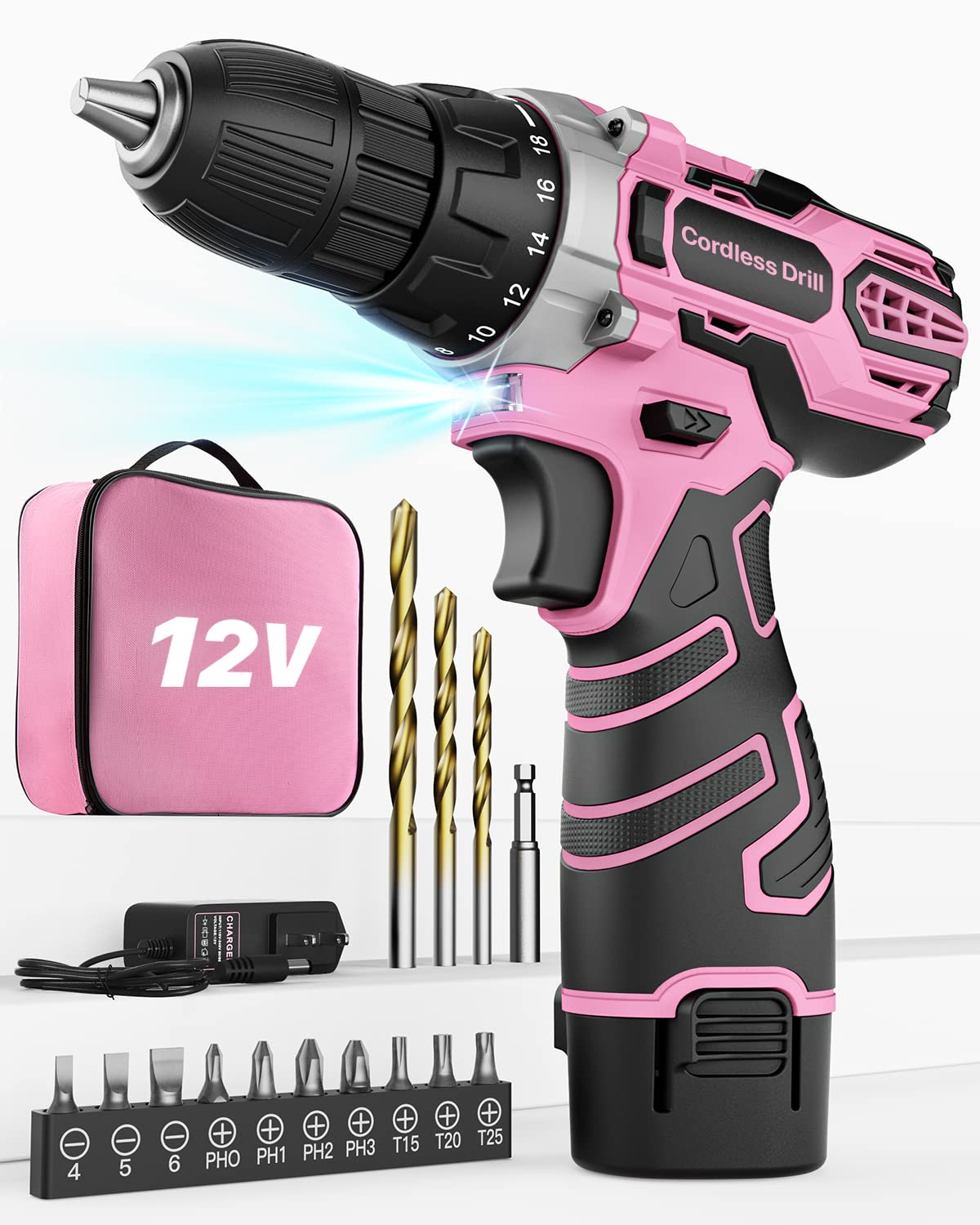 Świetny prezent dla kobiet: Lekka i przenośna wkrętarka akumulatorowa 12V z różową torbą materiałową, łatwa do przenoszenia, prosta i łatwa do rozwiązania problemy DIY. Idealna jako prezent świąteczny dla kobiet, które kochają majsterkowanie. Jeszcze nie jest za późno, aby zamówić i sprawić jej niespodziankę!