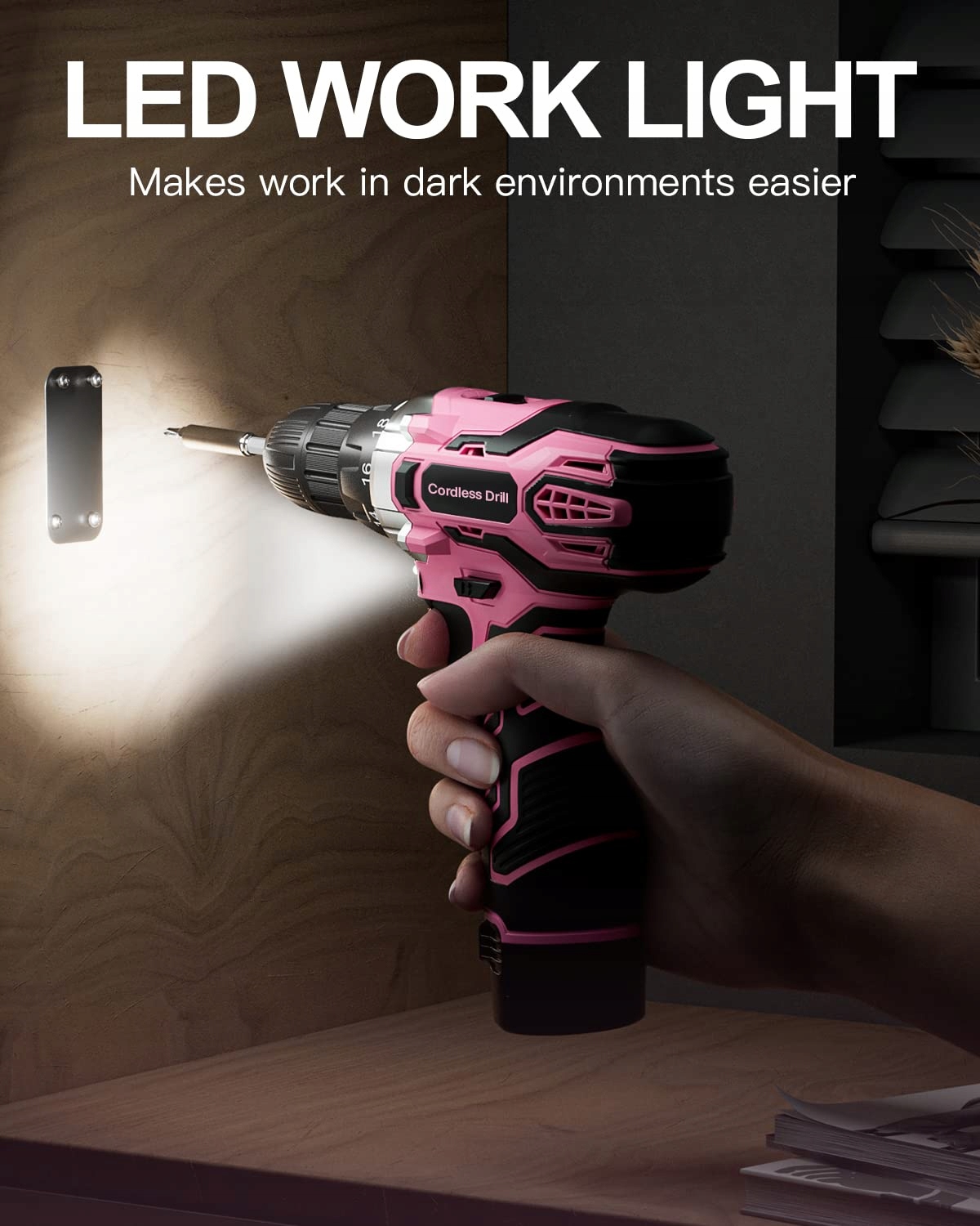 FAHEFANA 12V Różowy Zestaw Wiertarko-Wkrętarka 15 Akcesoriów LED