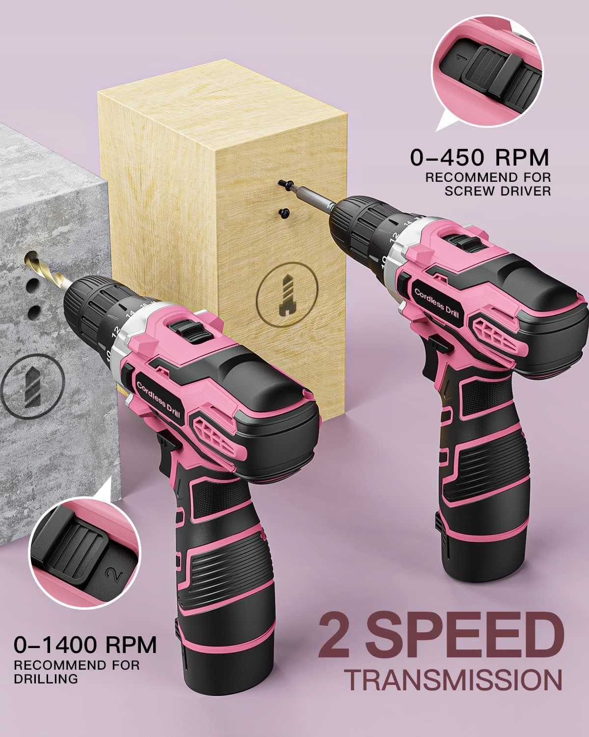 Mały rozmiar i mocna wydajność: Mocny silnik zapewnia potężny moment obrotowy 25 Nm dla różowej wiertarki 12V; 18+1 ustawień momentu obrotowego + ochrona momentu obrotowego, dostosowuje się do różnych scenariuszy, aby chronić obiekt przed uszkodzeniami spowodowanymi nadmiernym momentem obrotowym; dwa prędkości do wyboru, niska prędkość (0-450 obr/min) do wkręcania śrub, wysoka prędkość (0-1400 obr/min) do wiercenia lub innych intensywnych prac