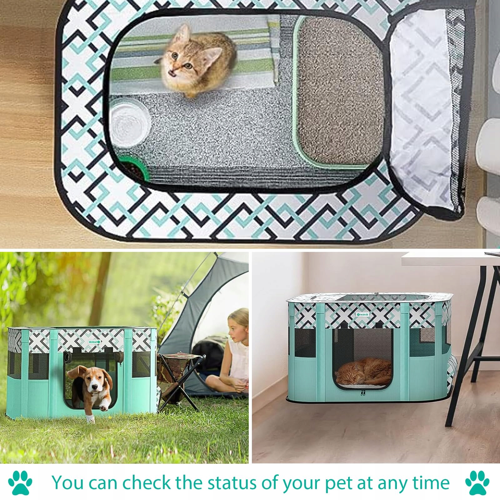 [Przyjazny dla zwierząt design] Ogrodzenie dla psów ma konstrukcję w kształcie muszli namiotu, co nie tylko zwiększa bezpieczeństwo, ale także zapewnia zamkniętą przestrzeń dla małych zwierząt do zabawy lub odpoczynku; Lekka siatkowa drzwi i świetlik zapewniają lepszą widoczność i wentylację, utrzymując cyrkulację powietrza.