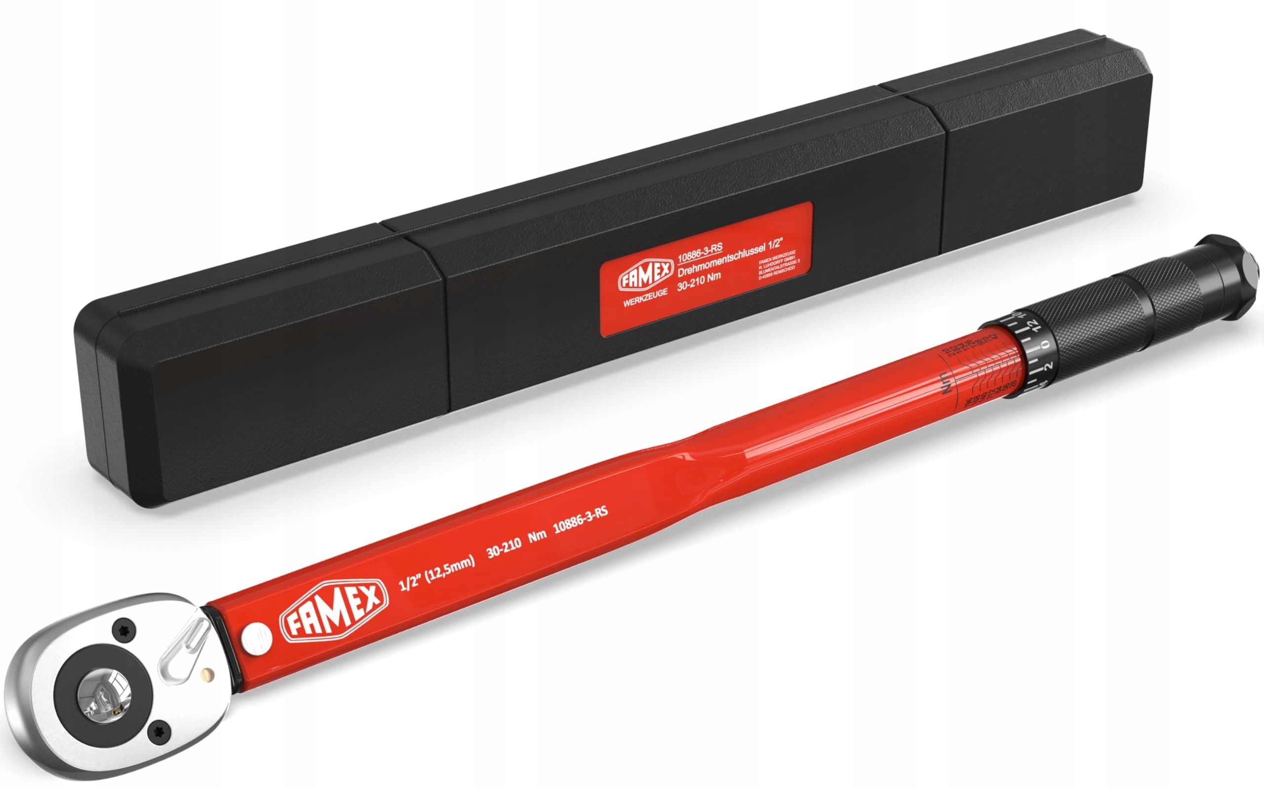 Klucz dynamometryczny FAMEX 10886-3-RS 1/2' (12,5mm) 30-210 Nm - w tym przedłużenie 3 nasadek/ochronnych wkładek do felg aluminiowych - do samochodu, motocykla, SUV-a, vana