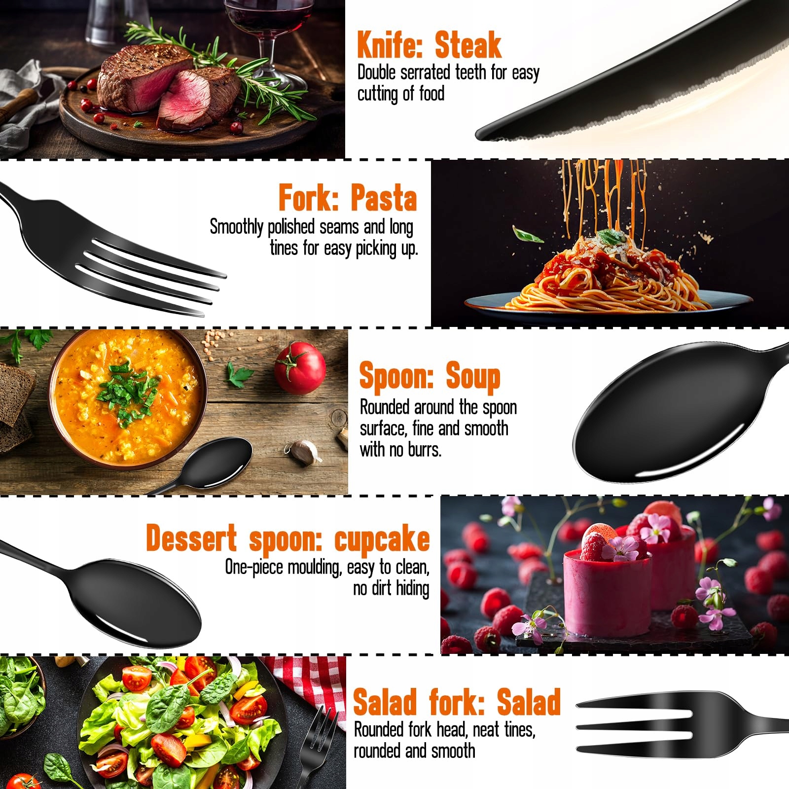 Stal nierdzewna bezpieczna dla żywności: Zestaw sztućców wykonany jest z wysokiej jakości stali nierdzewnej bezpiecznej dla żywności, formowanej w jednym kawałku. Zapewnia doskonałą ochronę przed rdzą i korozją oraz gwarantuje, że jest nietoksyczny, bez niklu, bardzo zdrowy i trwały.