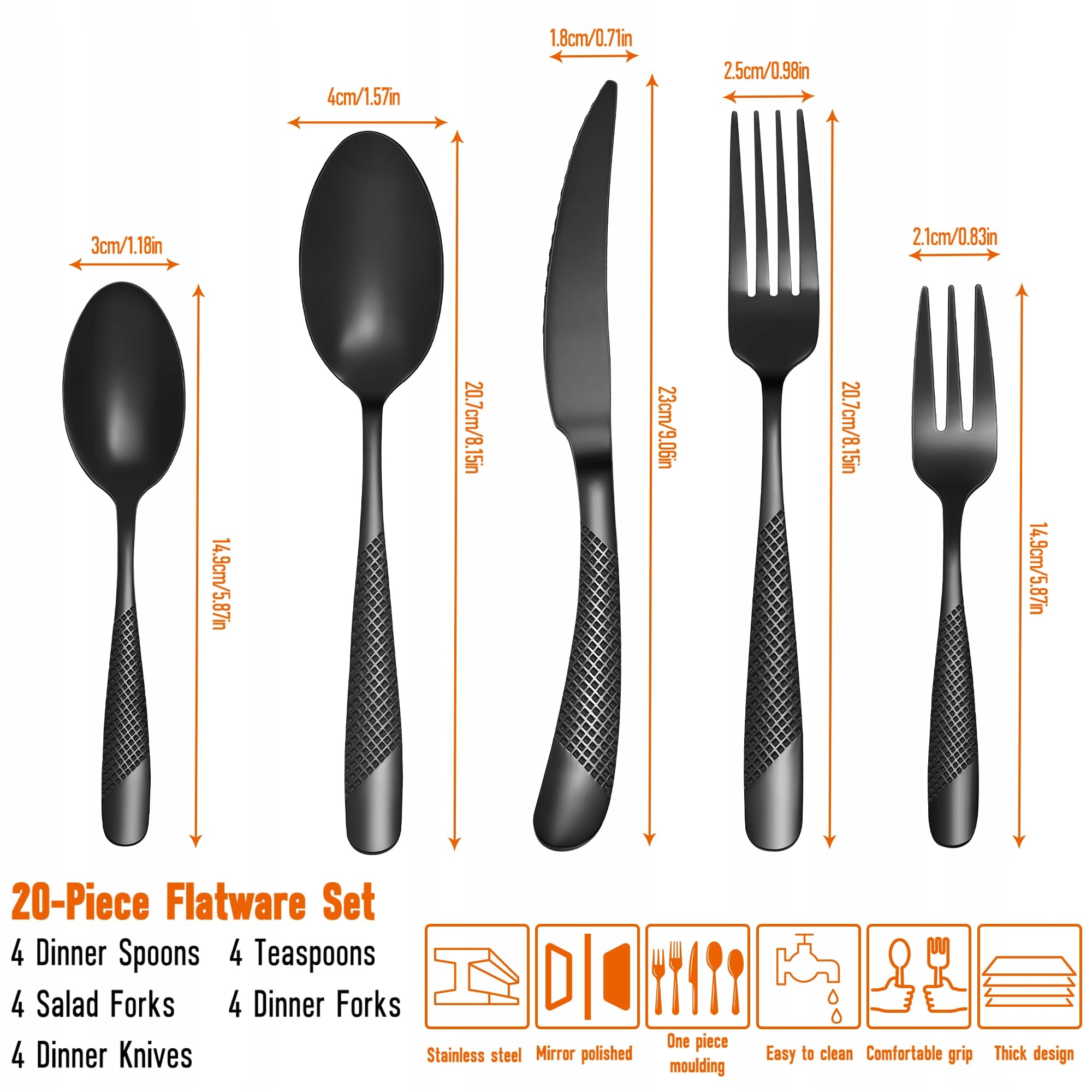 Zestaw sztućców FANTICDE dla 4 osób, 20-częściowy zestaw sztućców ze stali nierdzewnej czarny matowy/Zestaw sztućców z nożem, widelcem, łyżką, wysokiej jakości sztućce ze stali nierdzewnej, nadające się do mycia w zmywarce