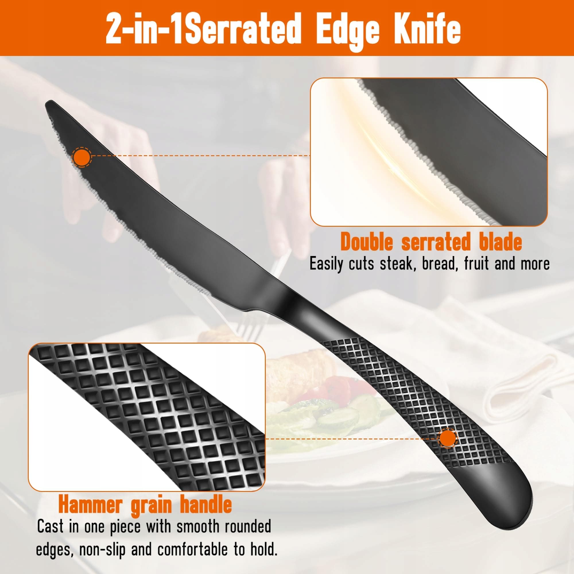 Łatwe krojenie: Nowy ultrawytrzymały nóż do steków posiada innowacyjne podwójne ząbkowanie, które jest idealne do różnych potrzeb krojenia. Niezależnie od tego, czy to świeże owoce, soczyste warzywa, delikatny stek czy obfity obiad, gwarantuje, że każdy cięcie jest precyzyjne i gładkie.