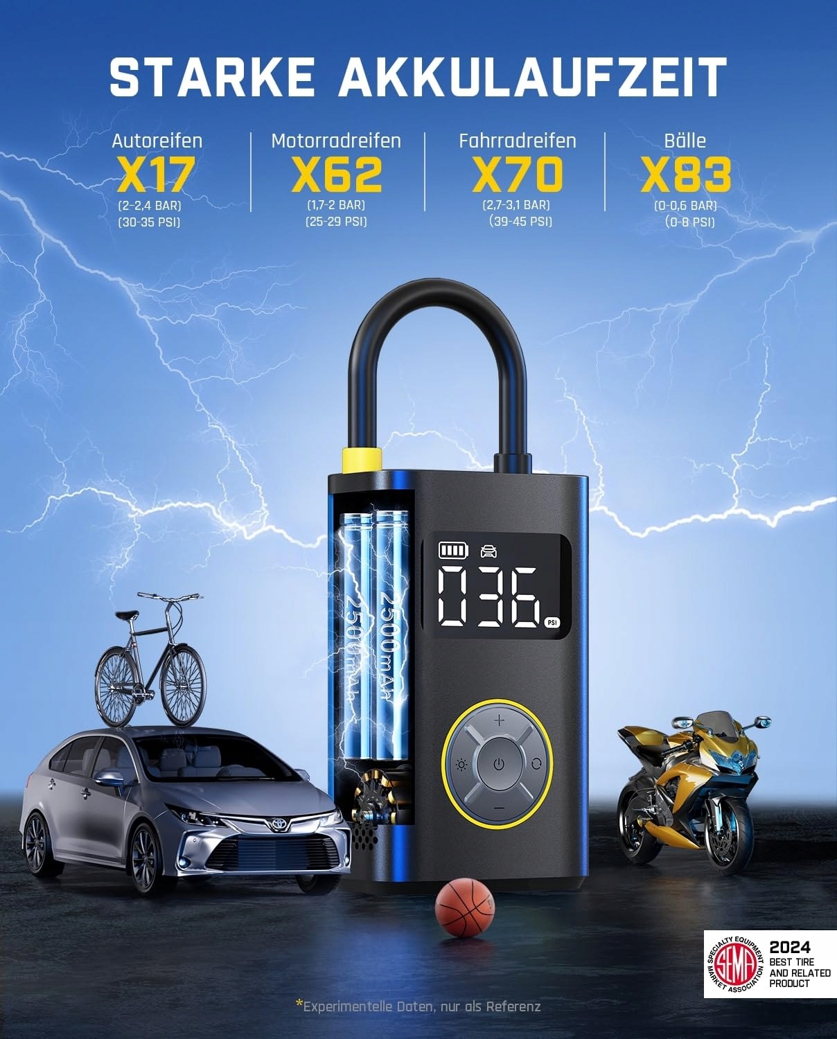 1 Min Szybkie Napełnianie: Pompka X9 Pro ma wartość ciśnienia powietrza do 10,3 BAR/150 PSI. Przytrzymaj długo prawy przycisk przeliczenia, aby zmienić jednostki PSI➡KPA➡BAR. Napełnia opony samochodów kompaktowych (2➡2,4BAR) w zaledwie 1 minutę. Odpowiednia do rowerów górskich, szosowych, motocykli, samochodów, piłek itp.