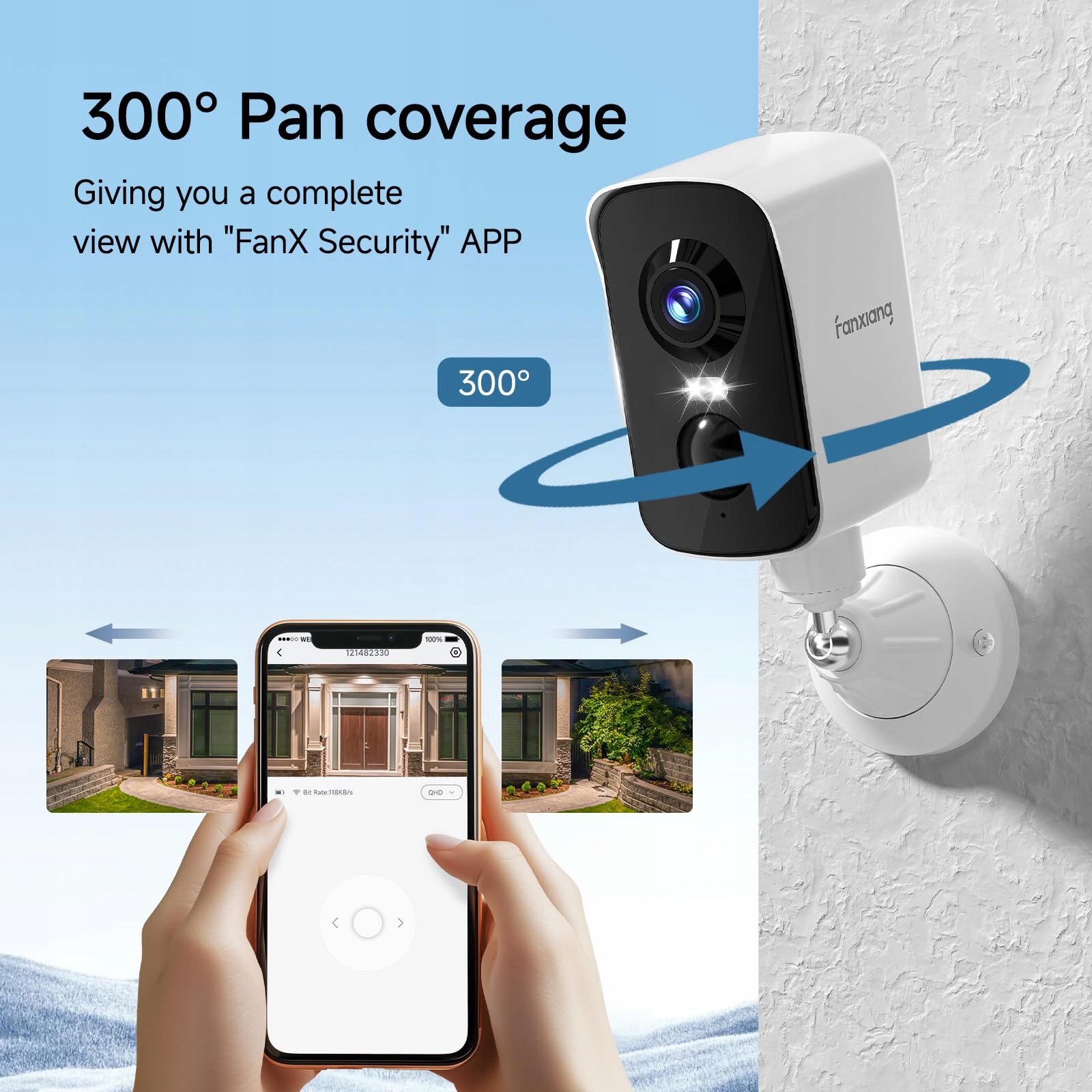300° obrót i łatwa instalacja: W porównaniu z innymi kamerami monitoringu zewnętrznego na rynku, które obejmują tylko kąt widzenia od 90° do 120°, nasza kamera może być obracana poziomo o 300° za pomocą aplikacji, dzięki czemu bez problemu uzyskasz widok 360°. Bez dodatkowych kabli ta kamera WiFi może być umieszczona na stole, zamontowana na ścianie lub przyczepiona do sufitu. Po prostu pobierz aplikację ''FanX Security'' na swój smartfon i możesz łatwo podłączyć i skonfigurować kamerę CCTV w ciągu zaledwie 5 minut za pomocą aplikacji