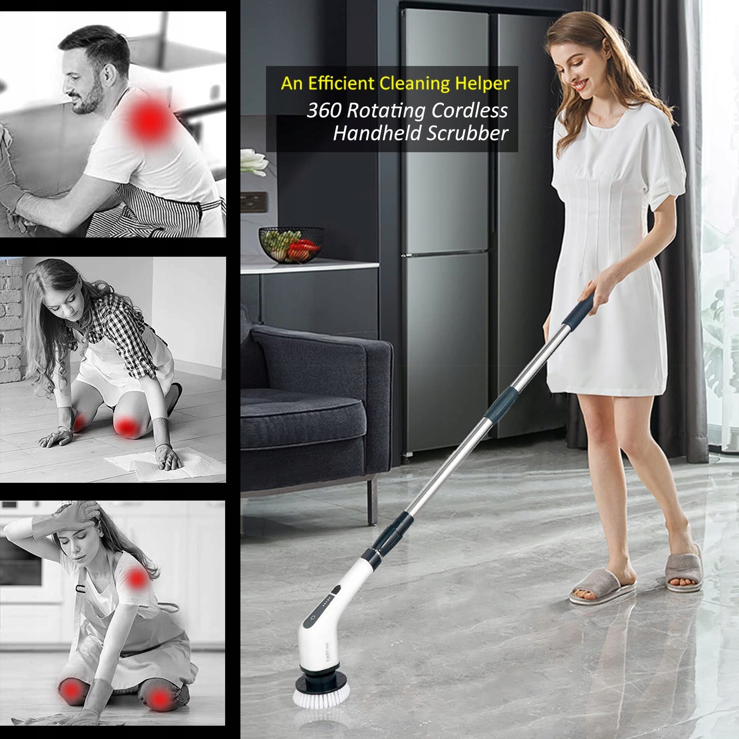 [Wygodne i skuteczne narzędzie do czyszczenia] - Dzięki temu elektrycznemu szorowaczowi możesz wyczyścić całe swoje mieszkanie za jednym razem. Mocny silnik szorujący do głębokiego czyszczenia. Wbudowany silnik napędza obracającą się głowicę szczotki, która obraca się z dużą prędkością i w połączeniu ze środkiem czyszczącym szybko usuwa uporczywe plamy, sprawiając, że podłoga kafelkowa wygląda jak nowa.