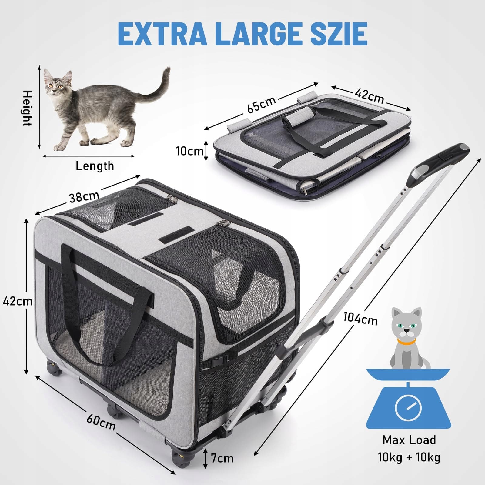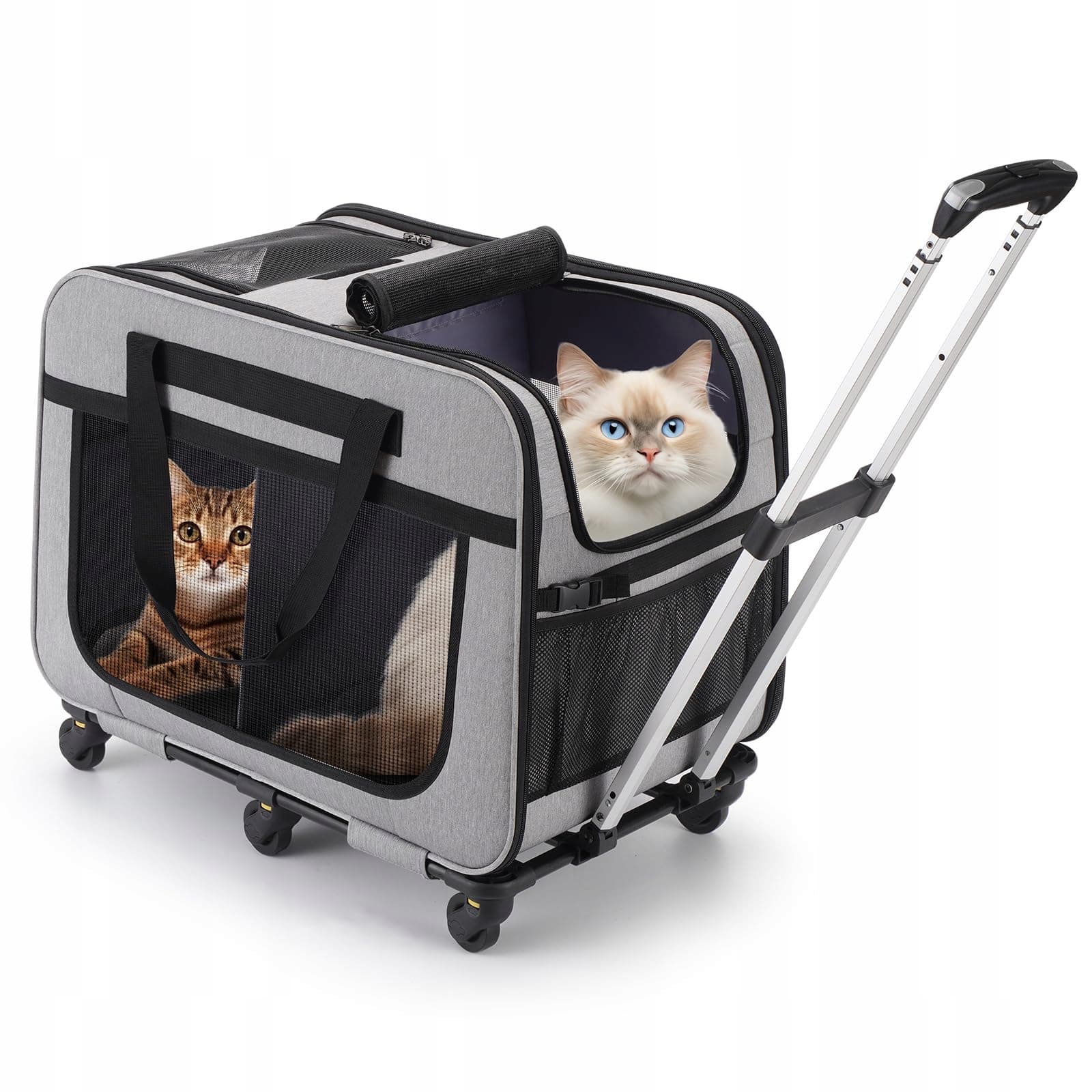 FASNATI Bardzo duża podwójna torba na zwierzęta z odpinanymi kółkami dla kota/psa, składana torba na kółkach dla 2 kotów, torba podróżna dla zwierząt na spacery/kemping, szara