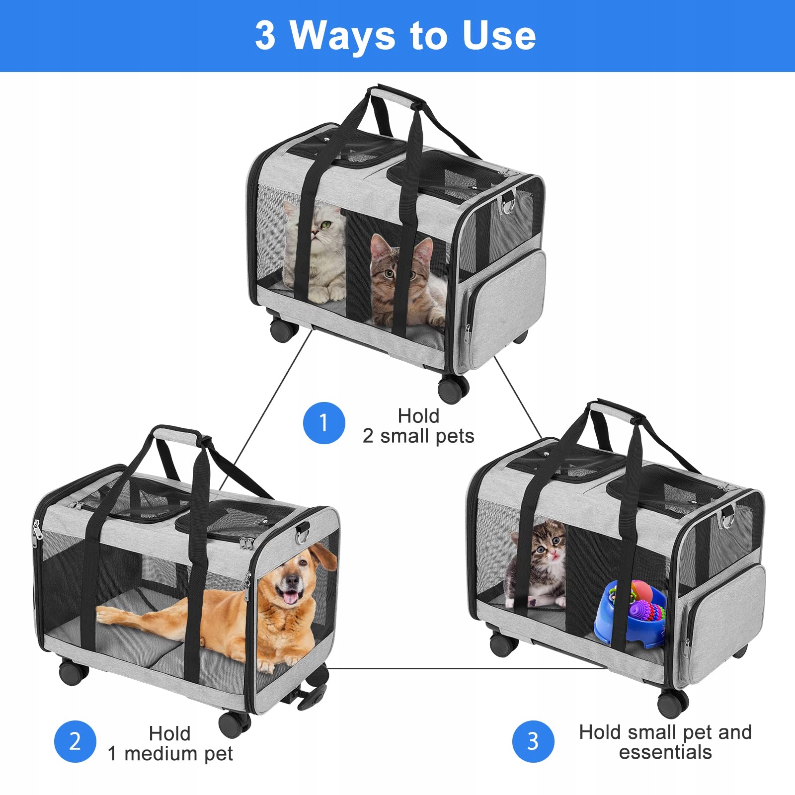 2-w-1-Design: Posiada dwie oddzielne przegrody, aby pomieścić 2 małe zwierzęta i trzymać je oddzielnie (szczególnie odpowiednie dla kotów), do przechowywania ubrań i ważnych przedmiotów lub dla małego do średniego zwierzęcia poprzez usunięcie przegrody, która jest przymocowana do torby za pomocą rzepu, idealna dla osób z wieloma małymi zwierzętami