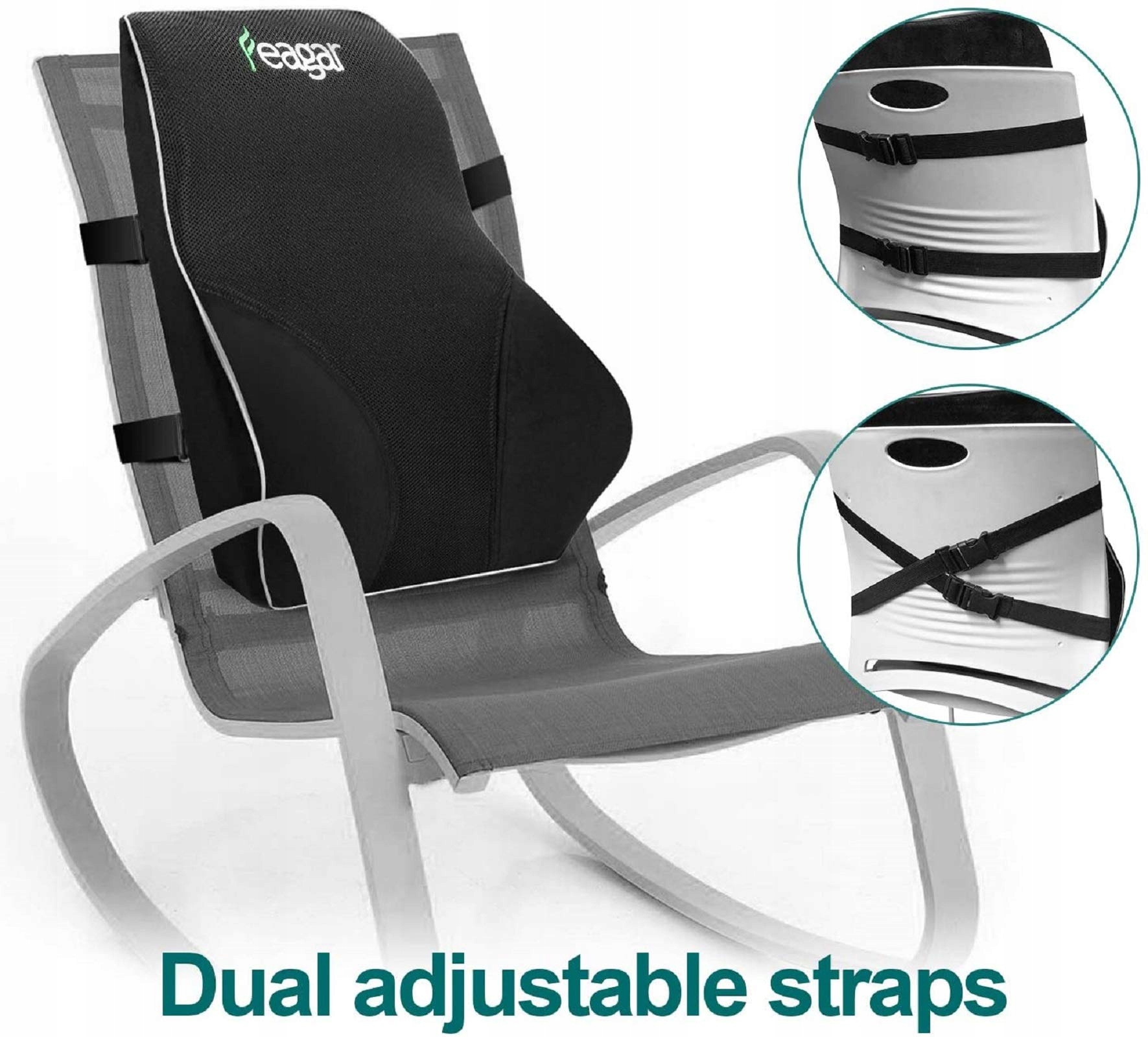 [2 antypoślizgowe paski]: -Poduszka lędźwiowa zawiera dwa regulowane paski, które skutecznie mocują poduszkę na siedzeniu bez przesuwania. Materiał 3D-Mesh i aksamit utrzymują chłód i suchość. Pokrowiec poduszki lędźwiowej można prać w pralce.