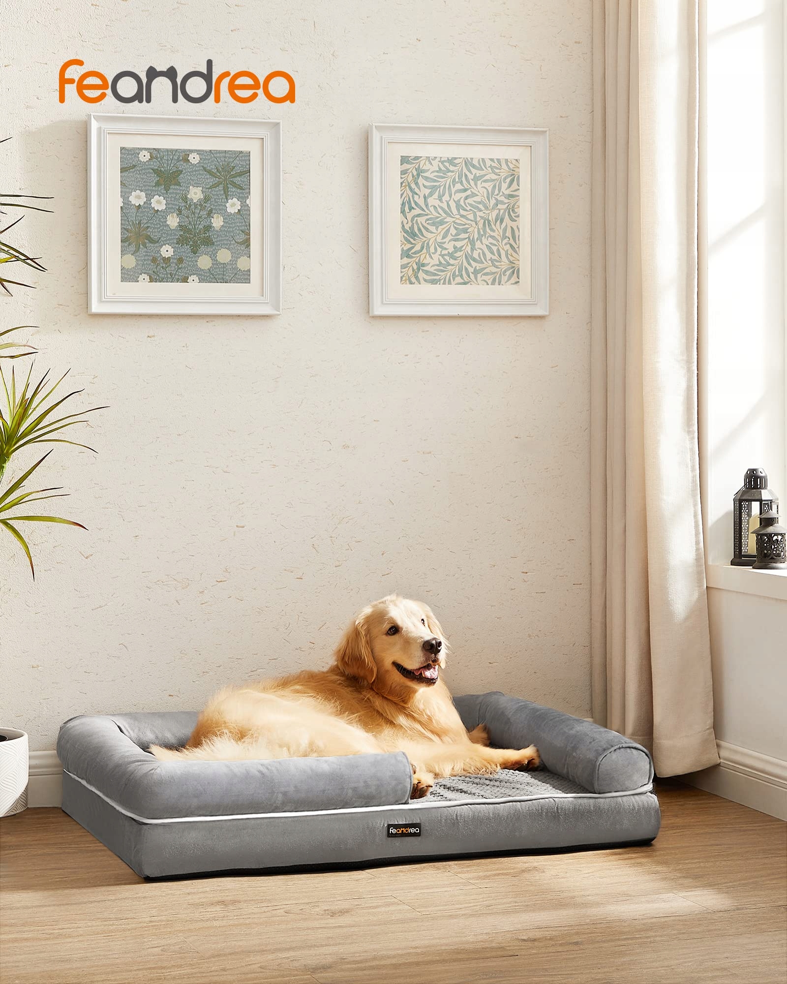 Feandrea ortopedyczne legowisko dla psa, poduszka dla psa, kosz dla psa, miękkie wypełnienie, sofa dla psa, podwyższone krawędzie, zdejmowany i nadający się do prania pokrowiec, 106 x 80 x 25 cm, antypoślizgowy spód, jasnoszary PGW077G02