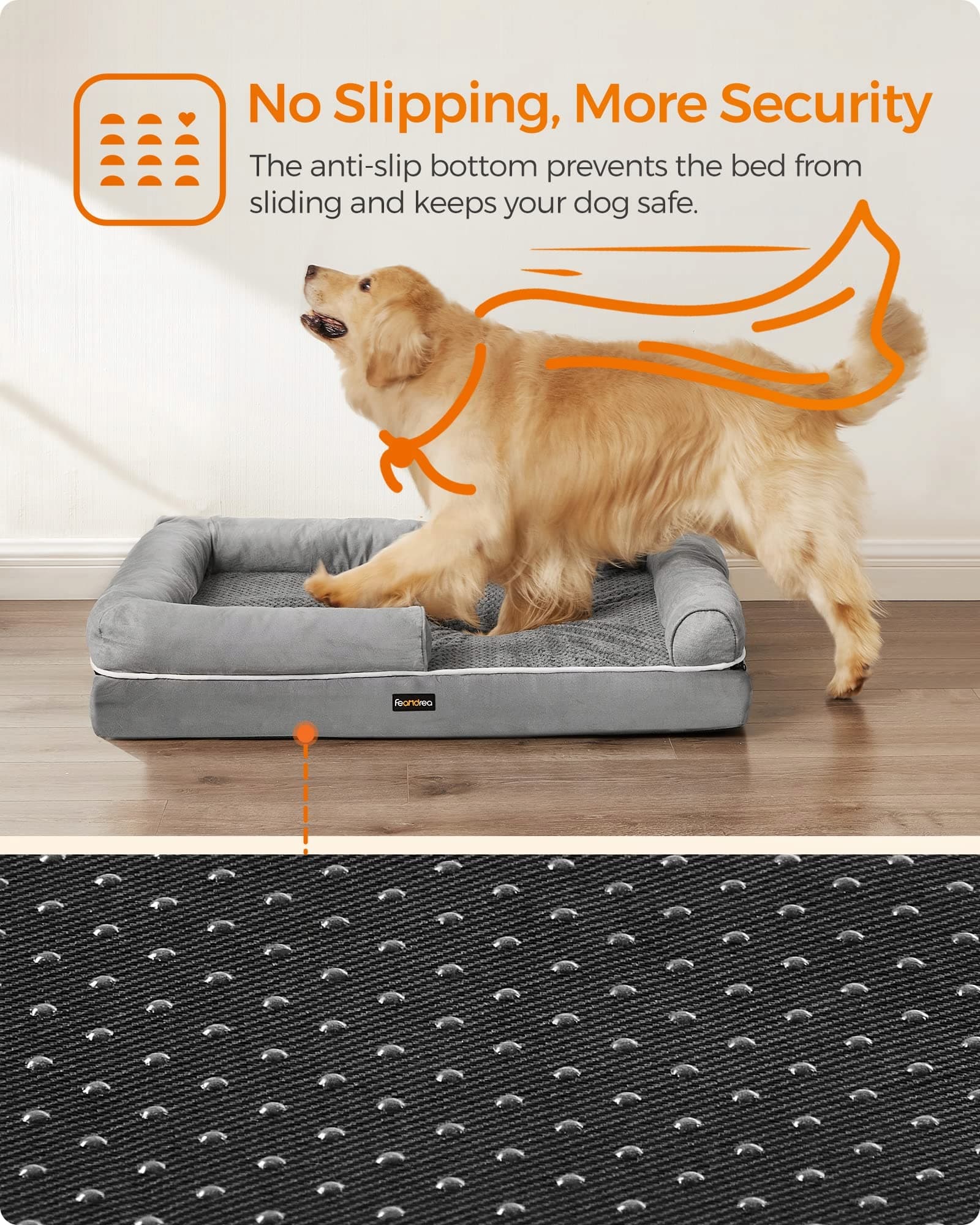 [ANTYPOŚLIZGOWY SPÓD]Aby Twój futrzany przyjaciel nie ślizgał się niechcący po salonie, ta sofa dla psa jest wyposażona w antypoślizgowy spód, dzięki czemu czuje się bezpiecznie podczas wchodzenia i wychodzenia