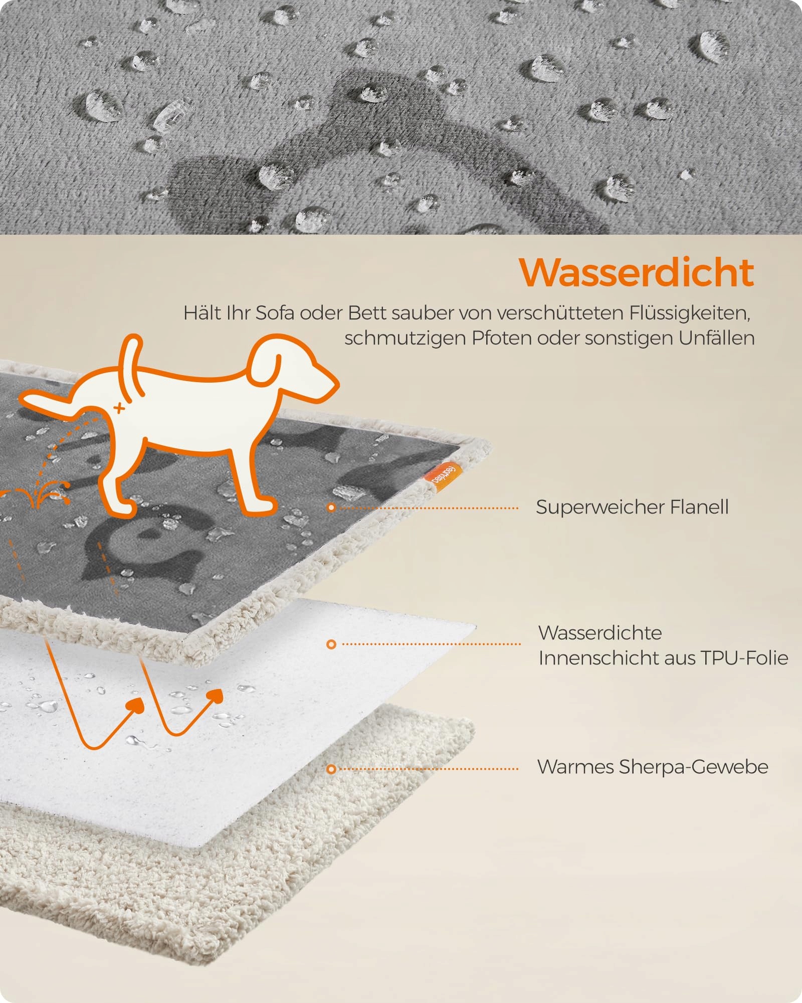 [Wodoodporny] Dzięki wodoodpornej warstwie TPU ten koc dla psa zapobiega przenikaniu płynów i chroni Twoją sofę lub łóżko przed drobnymi wypadkami, płynami i brudnymi łapami. Możesz więc bez obaw przytulać się ze swoimi futrzanymi przyjaciółmi
